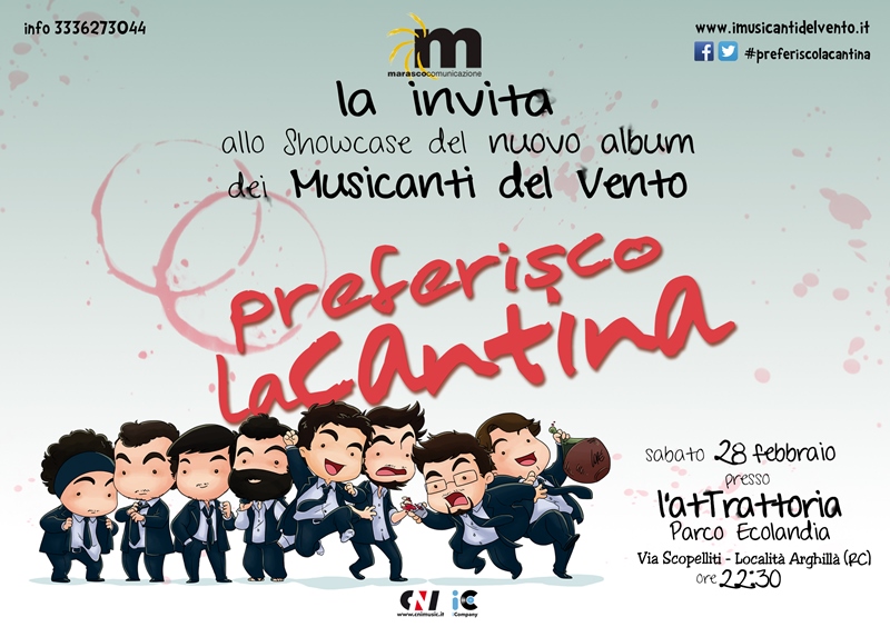 Il titolo “PREFERISCO la CANTINA” nasce per esorcizzare l’idea che la cantina è solo luogo di bacco e baldoria, bevute e ubriachi, la cantina è vista come una piazza, un luogo di interazione sociale e contatto umano reale, non virtuale! Un luogo dove succedono tante cose e dove si intrecciano storie di gente di ogni provenienza e tessuto sociale. Amore, passioni, lavoro, inquietudini sociali, allegria e goliardia questa è la cantina raccontata dai musicanti. Ma chi sono i Musicanti del Vento? I Musicanti del Vento nascono nell’inverno del 2008 come gruppo di riproposizione di brani della tradizione meridionale. Da subito però, inseriscono nel repertorio delle loro composizioni inedite, che nel 2009 danno vita al primo album: “Anime Deserte”, album in cui ancora si evince un forte richiamo all’etnicità calabrese. In questo stesso anno ottengono le prime soddisfazioni nazionali, partecipando prima alle finali del “Biella Festival” e poi al “Musicultura Festival”. Le conferme sono tante, così come l’esigenza di ricercare nuove espressioni artistiche; è così che nel 2010, viene edito il secondo album :“L’Isola dei Burattini”, una prospettiva ed una dimensione decisamente a carattere più nazionale,uno sguardo da occhio esterno sul mondo, su i suoi meccanismi assuefacenti ed indolori attraverso i quali ci si costringe la vita in una piatta favola già scritta. Proprio con un brano di questo disco (La cacca) gli MdV ottengono il 3° posto ed il premio miglior performance al “Lennon Festival”. Il terzo album :“Al circo del poeta matto” è un disco introspettivo,è un viaggio intimo attraverso le più svariate angolazioni. Nel 2013 esce il singolo/videoclip “Le chiavi della città” ed il videoclip del brano “Zappo la terra” , con il quale vincono il Gran Premio Manente nell’agosto del 2013. Nell’autunno seguente, gli MdV approdano alle fasi finali del Premio De Andrè.