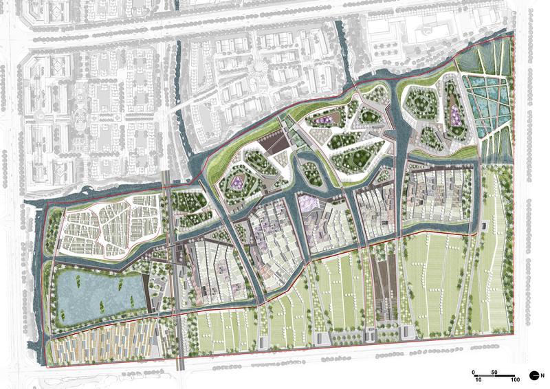 La strategia messa in atto nel progetto parte dallo studio del luogo, considerando come elementi fondamentali i canali esistenti di acqua, la tradizione storica delle water Town Cinesi, ed il tessuto agrario esistente. Questi elementi sono stati una risorsa nel processo creativo della strategia di paesaggio e, messi in relazione con le attività ricreative ed economiche richieste dalla committenza, sono diventati fondamentali sia per la conservazione della diversità biologica, sia per la creazione di un’economia a ciclo chiuso, che nel tempo sarà in grado di sostenere tutte le attività del parco. Partendo dunque dal tracciato dei canali esistenti è stata creata una nuova rete idrica, che ha reso possibile la manutenzione del tessuto agrario, la purificazione delle acque e il recupero degli habitat naturali utilizzando la vegetazione autoctona. I nuovi canali generano il design dell’intero parco creando delle Isole all’interno delle quali trovano posto le varie funzioni. Il progetto può essere così suddiviso in tre fasce: