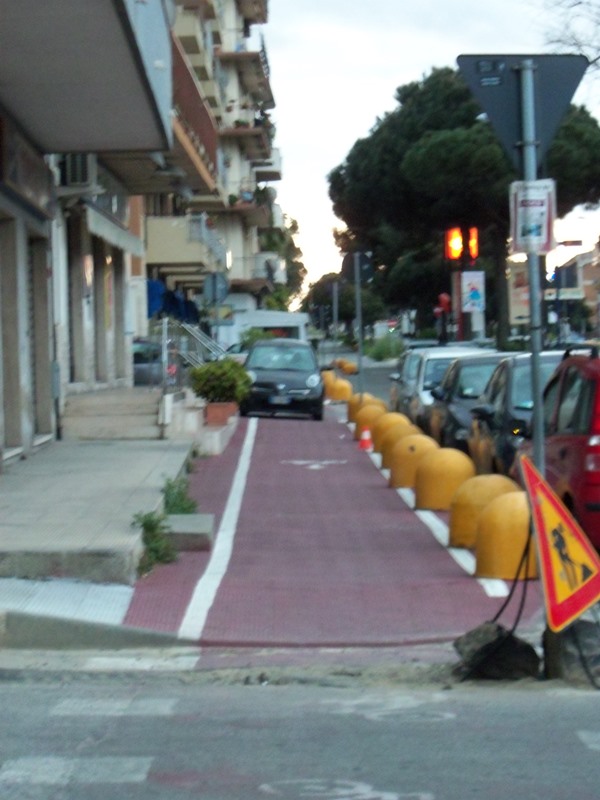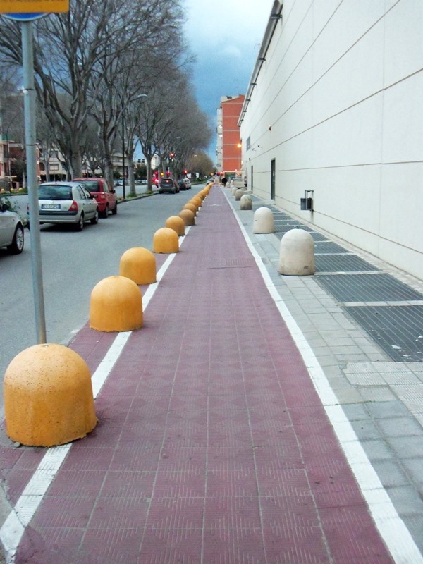 endo in tal modo congestione e inquinamento. Un concetto correlato è quello di rete ciclabile: le piste ciclabili di una città svolgono un ruolo nella viabilità globale, nella sicurezza ecc. se sono fra loro interamente collegate in rete, in continuità fra di loro e su ogni singolo percorso. Il disegno della rete è una attività di pianificazione e gestione della mobilità urbana. Parafrasando il famoso trio de ” i Tretre”, attori comici e cabarettisti napoletani che in molti ricorderanno nel mitico programma televisivo “Drive in”, ideato e scritto da Antonio Ricci nei primi anni 80, direi: “E’ chiaro il concetto”…! Bene (o forse male, anzi malissimo)! Allora tutti in “sella” alla bici per il nostro excursus di questa “benedetta” pista ciclabile che, a dir il vero, preoccupa e non poco (speriamo lo sia proprio “benedetta” perché i ciclisti che le percorreranno ne avranno tanto bisogno)! Eviterò riferimenti particolareggiati e alcuni scatti fotografici mi saranno d’ausilio per concettualizzare. Partiamo dalla foto 1. E’ evidente che questo tratto del percorso ciclabile non è per niente separato dal traffico motorizzato e/o da quello pedonale. Infatti, essi sono esattamente parallelamente attigui. Noterete che il “progettista” ha “ben pensato” (???) di far installare, per “separare la porzione destinata ai veicoli motorizzati e quella riservata ai pedoni, dei “dissuasori” in “cls” (cemento espanso). Cosa sono i “dissuasori” e a cosa servono? Un dissuasore è un dispositivo stradale utilizzato per impedire il passaggio o la sosta ai veicoli, non certamente per delimitare una pista ciclabile! Costo di ciascun “dissuasore” circa € 50,00 + I.V.A. Quanti se ne conteranno di questi dissuasori nella pista ciclabile di Reggio Calabria? Al “certosino ragioniere” lasciamo la conta e la comunicazione del dato economico sostenuto da una città, Reggio Calabria, che non “naviga” certo in acque chete ormai da diversi anni! Ipotizzo: se anche a seguito di questa modesta riflessione, i famigerati dissuasori dovessero essere rimossi, quale nuova destinazione e quali costi il comune dovrebbe sostenere ancora per il loro ricollocamento? Una spesa da Guinness World Records! Ricordate,