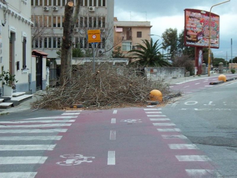 ho definito questa pista ciclabile “benedetta”! Già, solo il buon Dio potrà scongiurare che una rovinosa caduta del “ciclista” possa divenire fatale! Immaginiamo cosa questi dissuasori potrebbero causare se malauguratamente si dovesse sbattere violentemente la testa o altra parte del corpo. Di quali danni traumatologici potrebbe essere vittima il ciclista sperando che siano reversibili? Lo stesso dicasi se l’attempata signora (leggasi pedone) nel caso in cui dovesse perdere l’equilibrio e cadere! Domando al progettista: la collocazione di questi dissuasori, a mio modesto avviso impropriamente utilizzati, sono invece motivo di “sicurezza” per ciclisti e pedoni? Sarebbe tanto gradita la spiegazione invocata! Passiamo alla foto 2. La foto mette in risalto che la pista ciclabile é interrotta da un auto parcheggiata proprio sul tratto interessato! Senza fare retorica in merito l’educazione e il senso civico che spesso lascia a desiderare (non è proprio solo a una sparutissima minoranza di cittadini ad onor del vero), e per dirla alla “Lubrano”, grande giornalista già conduttore di “mi manda Rai tre”, “La domanda sorge spontanea”: … e i Vigili Urbani saranno intervenuti per sanzionare e ricreare le condizioni di percorribilità della pista e della confinante porzione del calpestio pedonale? A chi scrive non è dato sapere. Foto 3. Oggi, “lunedì dell’Angelo”, quest’altro tratto della pista ciclabile è interrotto da rami potati la settimana scorsa. Una piccola divagazione, ma non troppo. Questo “scatto” mi procura malinconia, non solo perché mi riporta indietro con gli anni, ma soprattutto perché mi ritorna in mente una delle tanti frasi del grande Sindaco di Reggio Calabria “Italo Falcomatà”: … è il buon senso che fa grande una città! Proprio il buon senso avrebbe imposto la pulizia del sito immediatamente dopo la potatura degli alberi, non solo per il ripristino della destinazione d’uso del sito, ma anche per il decoro e la dignità di cui spesso si parlava con il compianto Falcomatà! Francamente “ho poltrito” anche dopo la sosta “Pasquale” e non ho il dato numerico di quanto ad oggi sia costata la pista ciclabile ai cittadini di