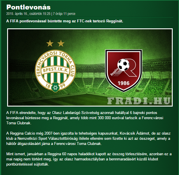 La penalizzazione della Reggina in classifica rischia di diventare di 22 punti: all’attuale -16, infatti, potrebbe aggiungersi un altro -6 per la storica vicenda di Kovácsik e la lunga vertenza, iniziata otto anni fa, con il glorioso club ungherese Ferencvárosi, che a gennaio aveva lanciato un ultimatum di 60 giorni. Di giorni ne sono passati quasi 100, gli ungheresi sono andati fino in fondo e secondo un comunicato apparso oggi sul loro sito internet la FIFA avrebbe “ordinato” alla FIGC i 6 punti di penalizzazione alla Reggina. La società non ha ricevuto ancora alcuna notifica, si aspettano quindi le decisioni che assumerà la FIGC anche se ovviamente in queste situazioni, dopo un pronunciamento del massimo organo sportivo calcistico mondiale, non c’è altro da fare se non eseguire.