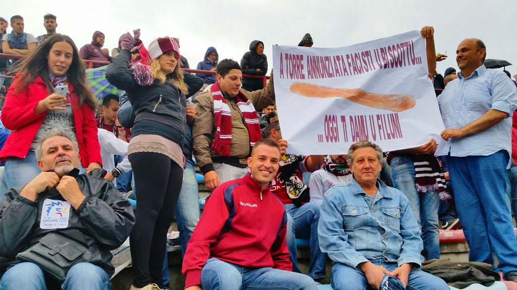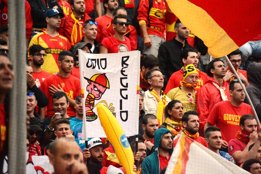 Mentre ieri a Roma i tifosi di Roma e Lazio si scontravano con armi, spranghe, coltelli e bastoni (due feriti in codice rosso, per fortuna non in pericolo di vita) un anno dopo i disordini costati la vita a Ciro Esposito, oggi per l’ennesima volta le tifoserie dello Stretto hanno dimostrato tutta la loro civiltà e maturità. Sugli spalti se ne sono dette di tutti i colori con cori, striscioni e coreografie non molto tenere.