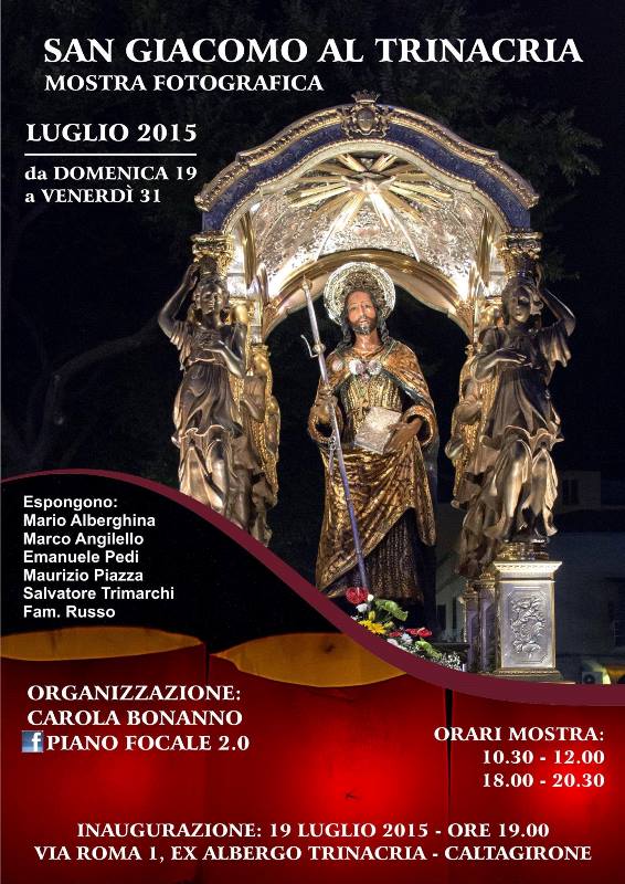 A Caltagirone è tutto pronto per l’inizio dei festeggiamenti ufficiali per il patrono della città, San Giacomo. La festa cittadina inizierà ufficialmente il 23 Luglio con i tradizionali fuochi d’artificio presso la Villa Comunale. La città, intanto, si prepara a vivere i numerosi eventi organizzati nei prossimi giorni, rivivendo la bellezza, la storia e la cultura di come nasce la festa patronale di San Giacomo, cosa significa per la città, ed il duro lavoro e l’organizzazione che c’è dietro tale evento. E lo fa, con la mostra fotografica organizzata presso lo storico albergo Trinacria, con la mostra fotografica San Giacomo al Trinacria, inaugurata il 19 Luglio la cui organizzazione è stata curata da Carola Bonanno con Piano Focale 2.0.
