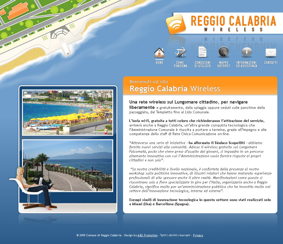 Giuseppe D’Ascoli, ai microfoni di StrettoWeb, ha cortesemente raccontato che “l’idea mi apparve subito entusiasmante e, avendo io all’epoca la delega all’innovazione tecnologica, decidemmo insieme di presentare la proposta al sindaco per poter avere il via libera alla sua attivazione”. Prosegue D’Ascoli: “questo progetto è stata inaugurato inizialmente solo in uno dei lidi che costeggiano il lungomare, precisamente l’ex Papero: il 4 luglio del 2008 fu avviato il servizio. All’epoca, Reggio Calabria era la prima città italiana dove si poteva navigare gratis in spiaggia, la terza città al mondo dopo Miami e Barcellona”.