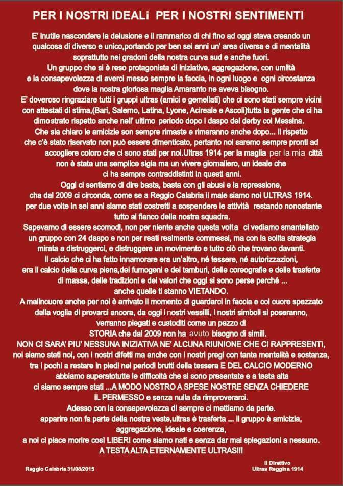 Nessun riferimento alla nuova società, nessuna polemica sul nome o sul marchio. Gli Ultras 1914 si sciolgono e ripongono i loro vessilli in un cassetto per altri motivi, mentre al Granillo ci dovrebbero essere regolarmente gli altri gruppi ultras del tifo amaranto.