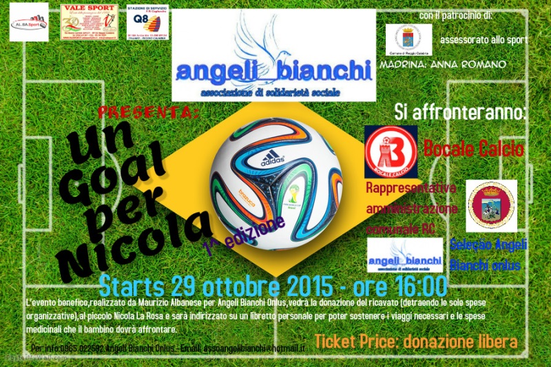 Il Presidente dell’Associazione Angeli Bianchi Onlus, Albanese Maurizio, si è mobilitato ed attivato subito per riuscire a creare un iniziativa in tempi brevissimi, in modo da riuscire a raccogliere ulteriori fondi prima della partenza di gennaio. Ieri, finalmente è stata data conferma alla famiglia di Nicola che l’associazione è riuscita ad organizzare un triangolare “UN GOAL PER NICOLA“, nel quale hanno avuto piena adesione del Bocale Calcio che metterà a disposizione anche lo stadio, e parteciperanno alla partita una rappresentativa di Angeli Bianchi Onlus e la rappresentativa calcistica del Comune di Reggio Calabria, il quale Assessorato allo Sport, come ha specificato la stessa Associazione in una nota, ha subito aderito a quanto proposto per aiutare il piccolo Nicola.