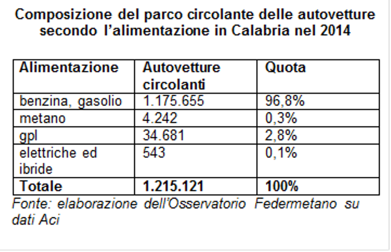 Le auto ecologiche in circolazione in Calabria sono il 3,2% sul totale del parco circolante. Questo dato emerge da un’elaborazione dell’Osservatorio Federmetano (struttura di ricerca sul metano per autotrazione) su dati Aci relativi all’anno 2014. Su un totale di 1.215.121 auto circolanti in Calabria, quelle ecologiche (elettriche, ibride, a metano e a Gpl) sono 39.466 (che corrispondono, appunto, al 3,2% del parco), mentre quelle alimentate a benzina e a gasolio sono 1.175.655, e cioè il 96,8% del parco circolante. A livello nazionale, le auto circolanti nel nostro Paese sono il 7,9% del parco, mentre quelle alimentate a benzina e gasolio sono il 92,1%. Le auto ecologiche, dunque, rappresentano ancora una quota marginale del parco circolante, che risulta composto per la maggior parte da auto alimentate a benzina e gasolio e quindi con livelli di emissioni particolarmente alti. Tuttavia, sottolinea l’Osservatorio Federmetano, quella delle auto ecologiche è una percentuale in costante crescita: infatti, come dimostrano i dati di settore degli ultimi anni, la quota di auto “verdi” in Italia è aumentata dell’1,3% dal 2010. Tale crescita, in particolare, è supportata dal considerevole aumento di auto circolanti a metano (+26,3% dal 2010). A questo proposito, evidenzia l’Osservatorio Federmetano, l’auto a metano costituisce senz’altro la soluzione più efficace tra quelle disponibili per ridurre l’impatto ambientale e risolvere i problemi di inquinamento delle aree urbane. Il metano, infatti, offre importanti benefici in termini di riduzione delle emissioni inquinanti e di C02 ed ha alcune valenze peculiari di grande rilievo rispetto a tutte le altre soluzioni a basso impatto, non solo dal punto di vista ecologico. “Il metano – sostiene Dante Natali, presidente di Federmetano – oltre ad essere il carburante più pulito ed ecologico tra quelli attualmente in commercio, è anche il meno costoso; ciò consente, quindi, di risparmiare nella spesa per il carburante. Oggi poi la rete di rifornimento per le vetture alimentate a metano è cresciuta molto: con oltre mille stazioni di rifornimento, la rete italiana è la più sviluppata a livello europeo. Inoltre, negli ultimi anni è aumentato anche il numero di modelli a metano proposti sul mercato dalla case automobilistiche. Questi due fattori hanno senz’altro contribuito alla crescente diffusione dei veicoli alimentati con questo carburante sulle strade del nostro Paese”.