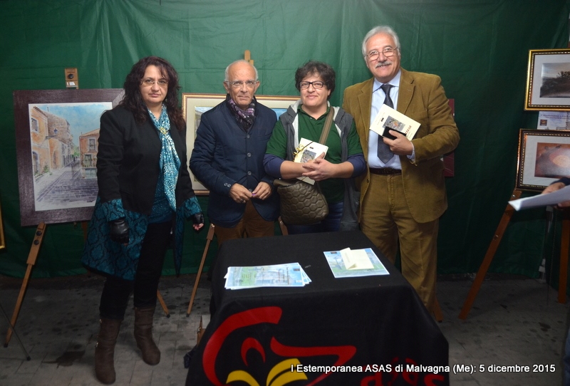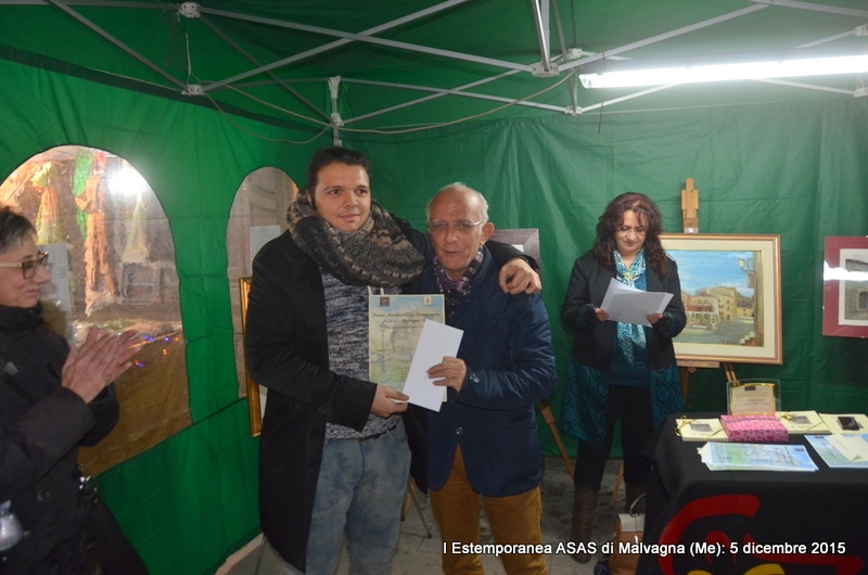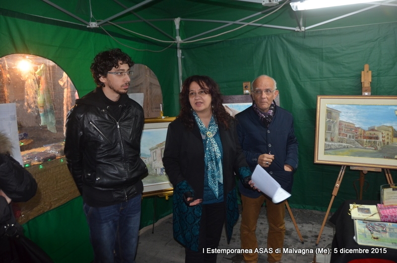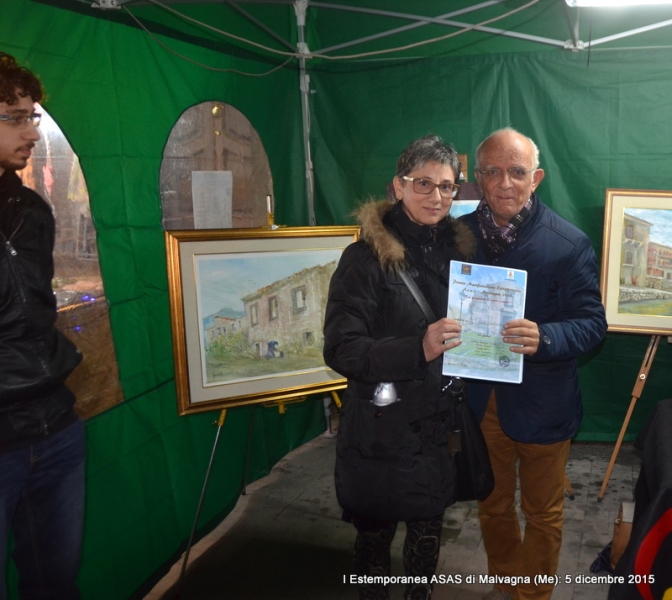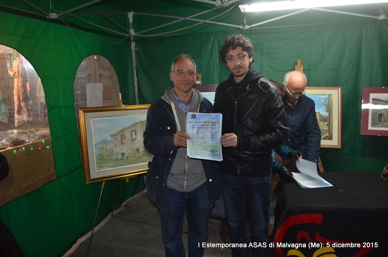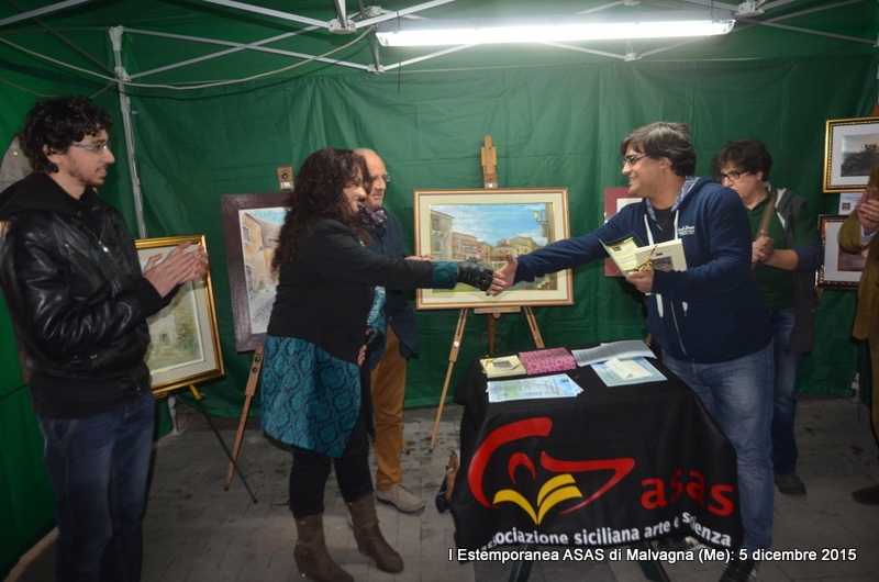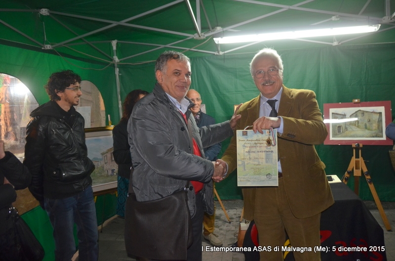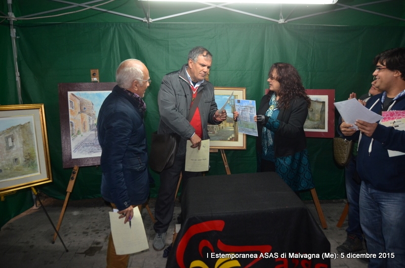 Si è conclusa il 5 dicembre 2015 con buon successo la Manifestazione della I Estemporanea Asas a Malvagna in occasione della Sagra delle Frittole e del Suino, realizzata grazie all’impegno dei responsabili dell’Associazione culturale Asas che si sono prodigati per la realizzazione dell’Evento, che purtroppo ha visto una scarsa, ma non scadente, partecipazione di artisti-pittori. Appunto per la scarsa partecipazione, gli organizzatori insieme (Comune e Asas), hanno optato ad attuare il Regolamento del Bando dell’Estemporanea il quale stabiliva che: “Un Premio in denaro da 200,00 euro per la pittura e un Premio da 50,00 euro per la fotografia, potranno non essere assegnati se non ci sarà un numero sufficiente di partecipanti, per una valida valutazione e saranno cumulati per l’anno successivo”. L’unica opera della Collettiva di pittura allestita, nei locali scuola di via Garibaldi a Malvagna il 28 novembre non ha partecipato al concorso in quanto non ci sono state altre opere partecipanti; l’autore Fausto Roberto Rizzo di San Cataldo (Cl) ha ricevuto, dal Vice sindaco Josè Russotti, che si è attivamente prodigato per l’evento, una Menzione con Medaglia Asas per l’acquerello “Allegoria a Malvagna” molto apprezzato oltre che dalla Giuria anche dai visitatori e partecipanti alla Sagra di piazza Roma, dove le opere sono state esposte al gazebo del Comune. Per la Collettiva d’Arte fotografica è stato attribuito il Premio da 50,00 euro offerto dal Comune di Malvagna al giovane Michele Vita di Messina; per l’Estemporanea il Premio in denaro da 300,00 euro è stato assegnato all’autore della prima opera classificata, il pittore Paolo Gaudenti con l’acquerello “Convento dei frati minori”, in base ai voti espressi dalla Giuria composta oltre che dal Sindaco dott. Giuseppe Cunsolo e dall’assessore alla pubblica istruzione, la dott.ssa Gabriella Caggegi, anche dai responsabili Asas Flavia Vizzari (Presidente), Pier Paolo La Spina (Vice presidente) e Luigi Terranova (Segretario e co-responsabile Asas per il Settore delle Arti visive). Assegnati anche i due Buoni Pranzo o Cena per il Ristorante L’Agave di Villafranca Tirrena (Me) per due persone, offerti dallo Sponsor Cristiano Dall’Armi direttore del VIOLA PALACE HOTEL al pittore e al fotografo secondi classificati: Maria Cristina Rinaldo e Fausto Roberto Rizzo.