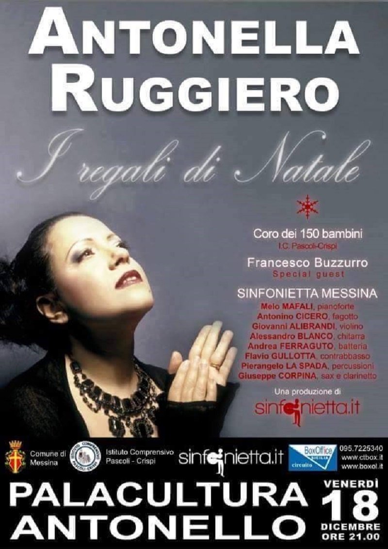 Chissà quale splendida aria si respirerà a Messina, nei dintorni del Palacultura, intorno alle ore 21.00. Antonella Ruggiero, insieme all’orchestra da camera Sinfonietta Messina (formata da Melo Mafali, arrangiamenti e tastiera; Alessandro Blanco, chitarra; Giovanni Alibrandi, violino; Giuseppe Corpina, clarinetto e sax contralto; Antonino Cicero, fagotto; Pierangelo La Spada, vibrafono; Flavio Gullotta, contrabbasso; Andrea Ferraguto, batteria e percussioni), al celebre chitarrista Francesco Buzzurro e al coro di 150 bambini dell’I.C. “G. Pascoli – F.Crispi” preparato da Nicola Arena, si esibirà in uno spettacolo tutto dedicato al Natale e all’augurio da fare ai messinesi. Una splendida occasione per la città di scambiarsi gli auguri in un’atmosfera musicale gioviale e d’effetto, data la caratura, sia umana che tecnica, degli artisti che si esibiranno il prossimo 18 dicembre al Palacultura. I biglietti sono già in vendita: non resta che acquistarli.