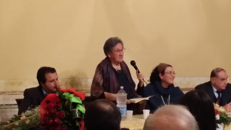 E’ toccato quindi alla protagonista della serata prendere parola. Eliana Giorli La Rosa, visibilmente emozionata, ha raccontato la nascita e la crescita delle poesie contenute in questo libro, molte delle quali prodotte nella vita quotidiana di tutti i giorni, durante i momenti di riposo tra una fatica domestica e l’altra. Pezzi di carta, alcuni di essi, sapientemente raccolti dai figli Santì ed Elisa e poi messi insieme nel libro in questione. La stessa ha poi parlato della sua vita, dei momenti belli e di quelli brutti, spendendo inoltre parole di grande amore e gratitudine nei confronti del defunto marito ma anche del PCI, il partito in nome del quale il loro amore è nato e cresciuto. Momento di dolcezza, dopo, quando il microfono è stato passato nelle mani della nipotina, che ha recitato a memoria una delle poesie contenute nel libro, ‘Il carretto del gelataio‘. A seguire l’intervento dell’artista Anna Parisi, curatrice delle suggestive ed affascinanti illustrazioni che accompagnano l’opera, e quello di Giuseppe Anania, presidente dell’associazione culturale ‘FilicusArte‘. All’associazione è legato un importante premio, indetto su scala nazionale ed intitolato alla memoria di Padre Peppino Cutropia, vinto da Eliana Giorli La Rosa, grazie alla poesia ‘Il mattonaio’. L’intervento conclusivo è stato affidato a Fabrizio Scibilia, docente di storia, che ha voluto porre l’attenzione sul carattere storico dell’opera, capace di abbracciare ben settant’anni di vita italiana e non solo. Basti pensare che la prima poesia risale al 1945, mentre l’ultima è datata febbraio 2014. Durante la serata, è stato dato spazio ad alcune delle liriche contenute nel libro e recitate da Loredana Celebre, Cinzia Vinci ed Imma Barillari, componenti dell’associazione ‘Castelli di Carta‘: tra le altre, ‘1945’ e ‘Libertà’. A conclusione, dopo i ringraziamenti di rito, Eliana Giorli La Rosa ha ricevuto i saluti e gli abbracci dei presenti in sala, firmando personalmente alcune copie dei libri.
