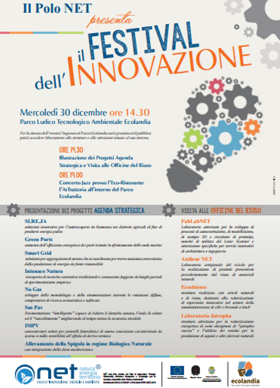 Mercoledì 30 dicembre appuntamento ad Ecolandia (Arghillà sud) dove, a partire dalle 14.30, si svolgerà il Festival dell’innovazione. Il Polo Net (Natura Energia e Territorio), partner del Consorzio di gestione del parco Ludico Tecnologico e Ambientale del Comune, presenterà i progetti realizzati nell’ambito dell’Agenda Strategica, il complesso dei finanziamenti ricevuti dai fondi Fesr a valere sulla programmazione 2007/2013: