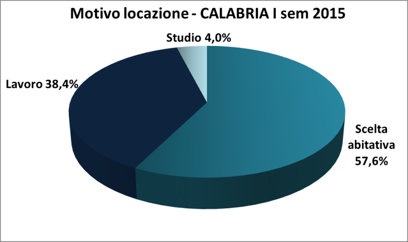 L’analisi dei contratti di locazione stipulati attraverso le agenzie del Gruppo Tecnocasa in Calabria, evidenzia che la maggior parte delle persone utilizza la formula dell’affitto per scelta abitativa (57,6%), il 38,4% lo fa per motivi di lavoro ed il 4,0% per motivi di studio. Il contratto di locazione più utilizzato è quello a canone libero da 4 anni più 4 (76,6%), notevolmente più bassa la percentuale di quelli a carattere transitorio (14,9%) ed a canone concordato (8,5%).