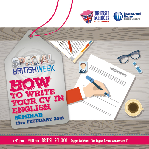 Oggi infatti è sempre più richiesto nel mondo del lavoro un CV di stampo internazionale, ma che mette a dura prova le capacità linguistiche di ciascuno. Non basta sapere l’inglese per compilare un ottimo Cv ma è necessario essere a conoscenza di espressioni e locuzioni proprie della lingua anglosassone per realizzare un curriculum perfetto e che faccia colpo. L’occasione migliore per poter imparare a farlo è al Seminario “How to write My CV in English”, che si terrà presso le sedi del BRiTiSH SCHOOL a Reggio Calabria, in Via Argine Destro Annunziata 13, martedì 16 Febbraio.