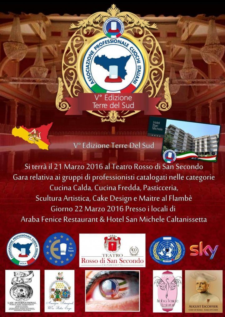 Il Teatro Rosso di San Secondo in provincia di Caltanissetta è stato grande spettatore della V^ Edizione dell’evento denominato “Terre del Sud”, che si e’ svolto il 21 ed il 22 marzo. Professionisti culinari si sono dilettati a preparare, tramite bellissimi cooking show, straordinarie pietanze da gara con successiva esposizione di sculture su vegetali e torte. Al termine dell’evento, i cuochi si sono trasferiti presso il Ristorante Araba Fenice, gestito dal presidente regionale APCI Stefano Sanfilippo, dove si e’ svolta la cena di gala con le premiazioni ed i riconoscimenti ai vari chef, tra i quali lo Spadaforese e Presidente dell’APCI Messina, Nato Micale.