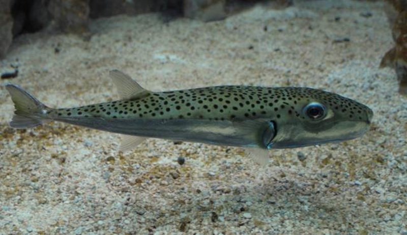 Pescato pesce alieno in Calabria: si dovrebbe trattare di un esemplare di Lagocephalus sceleratus appartenente alla famiglia dei tetraodontidi, facilmente riconoscibile dalla presenza in bocca di soli quattro grossi denti