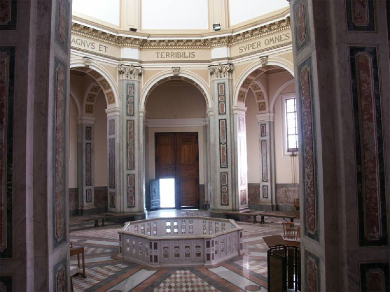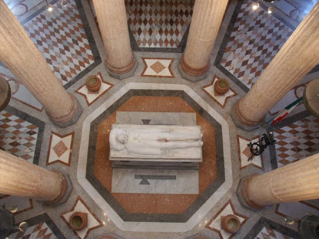 Il Sacrario, a pianta centrica, è costituito da una cupola segnata da 8 costoloni alla base dei quali, sulla cornice, sono collocate delle statue bronzee modellate dallo scultore romano Teofilo Raggio e fuse dalla Fonderia Artistica fiorentina, raffiguranti le virtù cardinali e teologali.