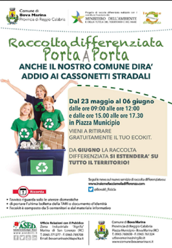 Partirà da lunedì 23 maggio la distribuzione del kit per la raccolta differenziata “porta a porta” nel Comune di Bova Marina che consentirà l’estensione del servizio su tutto il territorio comunale, l’introduzione del nuovo servizio di rilevamento elettronico dei mastelli consentendo la c.d. “tariffazione puntuale” e ponendo le basi per premiare in futuro quei cittadini virtuosi che faranno una corretta raccolta differenziata. Grazie al contributo finanziario concesso dal Ministero dell’Ambiente e della Tutela del Territorio e del Mare, che ha consentito l’avvio del progetto “Insieme facciamo la differenza”, selezionato come uno dei migliori progetti nell’ambito del bando per l’attribuzione di contributi economici in materia di riduzione e prevenzione della produzione dei rifiuti, di raccolta differenziata e riciclaggio, il Comune avrà la possibilità di acquistare tutto il materiale utile per l’avvio del nuovo servizio senza gravare in alcun modo sulle casse comunali. L’ASED srl gestore del servizio di igiene ambientale nel territorio comunale, allestirà un Eco Point in Piazza Municipio (Bova Marina) dal 23 maggio al 06 giugno per consentire la consegna ad ogni utenza domestica di un kit per la raccolta differenziata composto da 5 mastelli (per la raccolta di carta e cartone, vetro, multimateriale, indifferenziato, organico) dotati di TAG RFEED che permetteranno di identificare il contenitore per associarlo all’utente ed un quantitativo di sacchetti biodegradabili e compostabili per l’umido. Unitamente alle attrezzature verrà consegnato il materiale informativo composto da: carta della qualità dei servizi di igiene ambientale, Vademecum e calendario di raccolta. Nell’ occasione saranno fornite tutte le informazioni utili agli utenti. Nei prossimi giorni, l’ASED provvederà a consegnare anche le attrezzature per le utenze non domestiche. Per ritirare il kit e i sacchetti in mater-bi sarà necessario presentarsi presso il punto sopra indicato, muniti di documento di riconoscimento o copia dell’ultima bolletta della Tari. Il Sindaco, Vincenzo Crupi, ha manifestato la volontà di voler effettuare personalmente la prima consegna partendo dai più piccoli, a tal proposito in questi giorni si recherà personalmente negli istituti scolastici per consegnare l’attrezzatura per la raccolta differenziata. L’Amministrazione Comunale e la società ASED srl stanno molto investendo nella fase di comunicazione e sensibilizzazione, realizzando materiale informativo e calendarizzando incontri negli istituti scolastici ed in piazza. Inoltre sono attivi un numero verde, un sito internet dedicato e un account Twitter. Lo slogan “Insieme facciamo la differenza” sarà il leitmotiv del progetto. Differenziare è un piccolo gesto che sarà ricompensato da sicuri benefici, sia economici che ambientali e porterà ad un grande risultato: di¬fferenziare, riciclare e ridurre i rifiuti da conferire in discarica.