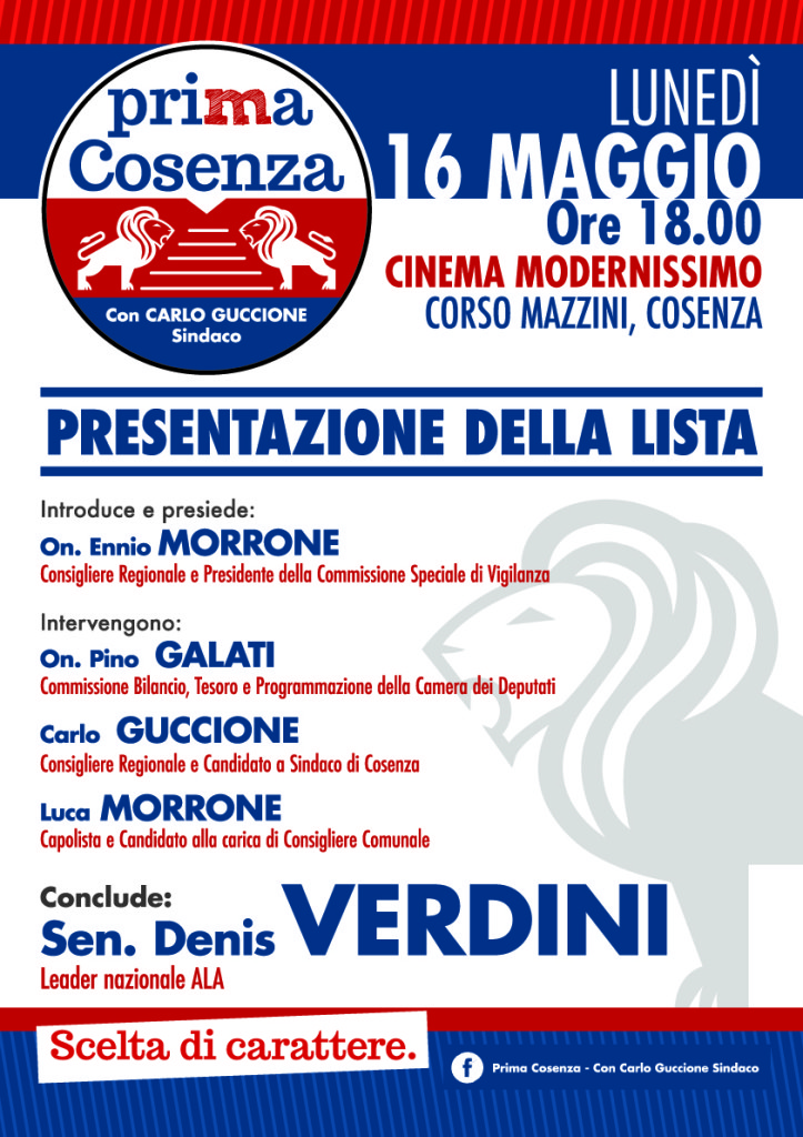 La lista “Prima Cosenza” presenterà ufficialmente i propri candidati ed il progetto politico a supporto della candidatura a sindaco di Carlo Guccione domani lunedì 16 maggio, alle ore 18.00, presso il cinema Modernissimo di Cosenza. L’incontro sarà presieduto e moderato dal consigliere regionale Ennio Morrone, ispiratore della lista. Interverranno tutti e trentadue i candidati alla carica di consigliere comunale ed in particolare il capolista di “Prima Cosenza” Luca Morrone, il deputato on. Pino Galati, il candidato alla poltrona di primo cittadino dell’Alleanza civica progressista Carlo Guccione. I lavori verranno conclusi dal senatore Denis Verdini.