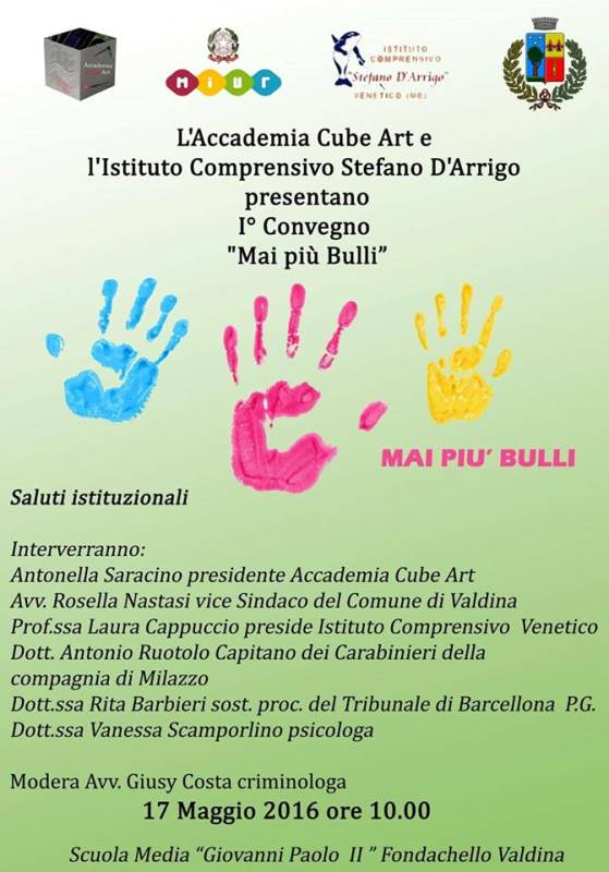Il bullismo è un grande malessere della nostra società, un disagio che si manifesta spesso tra giovani e adolescenti, ma non solo. Un fenomeno di arroganza sociale spesso sottovalutato, ma che da qualche anno è diventato un tema importantissimo da affrontare in qualsiasi settore. Le conseguenze del bullismo possono essere irreparabili: dalla depressione alla perdita dell’autostima ed altro ancora. Per parlare di tutto questo, l’Associazione Cube Art di Antonella Saracino insieme all’Istituto Comprensivo Stefano D’Arrigo, hanno organizzato, per giorno 17 maggio a partire dalle ore 10.00, presso la scuola media “Giovanni Paolo II” di Fondachello Valdina, il primo convegno denominato “Mai più bulli”. Un’occasione per trattare un tema preoccupante soprattutto nel mondo delle scuole. Oltre ad Antonella Saracino, Presidente dell’Accademia Cube Art e organizzatrice dell’evento, prenderanno la parola: il vice Sindaco di Valdina,Dott.Rossella Nastasi; la Preside dell’Istituto comprensivo di Venetico, Prof.ssa Laura Cappuccio; il Capitano della compagnia dei Carabinieri di Milazzo, Dott. Antonio Ruotolo; il sostituto procuratore del Tribunale di Barcellona Pozzo di Gotto, Dott.ssa Rita Barbieri; la psicologa, Dott.ssa Vanessa Scamporlino e la criminologa, Avv. Giusy Costa. Valido, inoltre l’apporto di Claudia Costa, responsabile della gestione grafica dell’intero convegno. Appuntamento dunque a giorno 17 Maggio 2016 per affrontare il bullismo e provare a sconfiggerlo, tutti insieme, con la conoscenza.