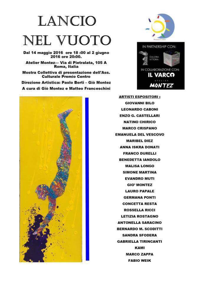 Sabato 14 maggio, l’Associazione Culturale Premio Centro, presenterà, a Roma, una meravigliosa ed interessante Mostra Collettiva denominata “Lancio nel vuoto”, che verrà ospitata nell’Atelier Montez , e sarà guidata da Giorgio Capogrossi.