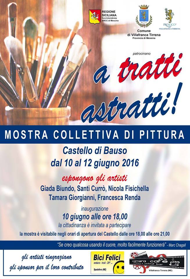 “Se creo qualcosa usando il cuore, molto facilmente funzionerà”, affermava il pittore Marc Chagall. Riportando questa citazione si presentato gli artisti che hanno pensato ed organizzato l’appuntamento “A tratti astratti”, una mostra collettiva di pittura che si inaugurerà venerdì 10 giugno alle ore 18,00 a Villafranca Tirrena all’interno delle sale del Castello di Bauso. Ad esporre le loro tele saranno cinque artisti del comprensorio tirrenico: Giada Biundo, Santi Currò, Nicola Fisichella, Tamara Giorgianni e Francesca Renda. Tutti hanno nel loro bagaglio artistico esperienze e sensibilità diverse ma, uniti dalla passione per l’arte pittorica, hanno voluto allestire questa collettiva non soltanto per offrire la loro arte ai visitatori ma per creare nuove e stimolanti collaborazioni. Per il taglio del nastro è previsto anche un rinfresco alla presenza delle autorità che hanno collaborato alla realizzazione dell’evento. L’evento, infatti, è stato patrocinato dall’Amministrazione Comunale e dalla Pro Loco villafranchese, la disponibilità dei locali del Castello, invece, è stata garantita dalla Sovrintendenza ai Beni Culturali di Messina. Inoltre hanno contribuito gli sponsor “Bici Felici” di Spafora e “Camera Café” di Villafranca Tirrena. Per ammirare le opere c’è tempo sino al 12 di giugno negli orari dalle 18 alle 21.