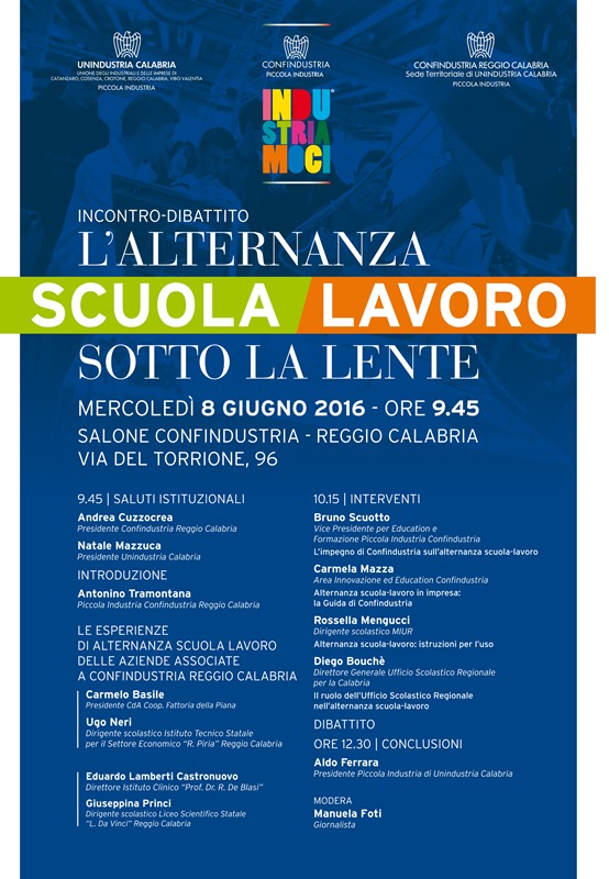 Si svolgerà mercoledì 8 giugno, inizio ore 9.45, presso la Sala Convegni di Confindustria Reggio Calabria (Via del Torrione, 96), l’incontro-dibattito dal titolo “L’alternanza scuola-lavoro sotto la lente” organizzato da Piccola Industria di Unindustria Calabria e Piccola Industria di Confindustria Reggio Calabria.