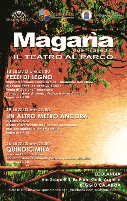 La suggestione del teatro in un luogo magico: nell’ambito della rassegna “Magarìa 2016”, torna martedì 19 luglio alle ore 21 “Un altro metro ancora – Ballata sul bordo della vita”, lo spettacolo che, nato sul testo della scrittrice Katia Colica, è stato messo in scena lo scorso inverno con successo da Gaetano Tramontana che ne ha curato anche la regia. Prosegue, quindi, la minirassegna estiva nata nel 2007 da un’iniziativa di SpazioTeatro che ha voluto creare una simbiosi tra l’arte teatrale e alcune location dal particolare pregio paesaggistico. Un connubio all’insegna della bellezza, questo, che ha già registrato il successo nella performance di apertura, “Pezzi di legno”, ultimando pochi giorni fa il Laboratorio dell’Attore che SpazioTeatro pone come caposaldo della propria attività fin dal 1999, credendo nella formazione, nei talenti e nelle passioni che il territorio possiede. «Stiamo ancora smaltendo l’adrenalina dello spettacolo del nostro laboratorio che ha inaugurato quest’anno la rassegna ad Ecolandia», spiega Gaetano Tramontana molto soddisfatto della serata: «Lavorare e concludere il percorso con un gruppo così entusiasta di allievi dalle età più diverse ti fa passare da fasi di grande stress a momenti di esaltazione e soddisfazione unica. Con una nostra produzione,“Un altro metro ancora”, ci rituffiamo nello scenario di Ecolandia che la sera, abbinato al teatro, diventa magico. È per noi quasi un debutto in quanto è uno spettacolo ancora giovane che per la prima volta esce dal luogo che ha visto la sua gestazione e la sua nascita, cioè la sala di SpazioTeatro. Questo ci carica molto e speriamo che chi verrà a incontrarci rimanga soddisfatto da questa esperienza che faremo in comune». Il protagonista, l’eroe per caso Tano, torna quindi in scena, stavolta in una location all’aperto e che offrirà agli spettatori sfumature del tutto nuove e percezioni originali che solo il teatro in armonia col luogo riesce a dare. La drammaturgia, ispirata a una storia vera, racconta di un giovanissimo ribelle fuggito dall’esercito fascista che ha guidato un gruppo di famiglie sfollate lungo un campo minato, salvando loro la vita e assumendosi la responsabilità di essere il primo della fila rischiando di saltare in aria. Disertore e per sua stessa ammissione poco coraggioso, non ha nessuno da cui tornare e si sente già frammentato da un passato di guerra. Durante questo percorso si ripercorre assieme a lui la sua vita, le sue aspettative deluse, i suoi fallimenti, tutti raccontati in tono lieve e sereno, non raramente ironico. Lo spettacolo sulle musiche originali di Antonio Aprile, vede la partecipazione in video di Enza Caridi. Si avvale inoltre della collaborazione di Simone Casile per le luci e di Roberto Morabito e Katia Spanò per l’aspetto scenico. Per informazioni e prenotazioni degli spettacoli si può consultare il sito web www.spazioteatro.net, email: info@spazioteatro.net oppure contattare il numero 339.3223262.