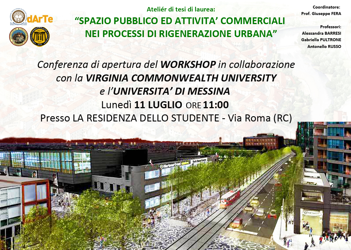 Lunedì 11 luglio 2016 alle ore 11, presso la Sala riunioni della Nuova residenza universitaria di via Roma, avrà inizio il Workshop di progettazione, inserito nell’ambito delle attività relative all’Atelier di tesi di laurea del Dipartimento Architettura e Territorio (Università Mediterranea di Reggio Calabria), incentrato su “Spazio pubblico e attività commerciali nei processi di rigenerazione urbana” per il coordinamento del prof. Giuseppe Fera, in collaborazione con i i professori Alessandra Barresi, Gabriella Pultrone ed Antonello Russo.