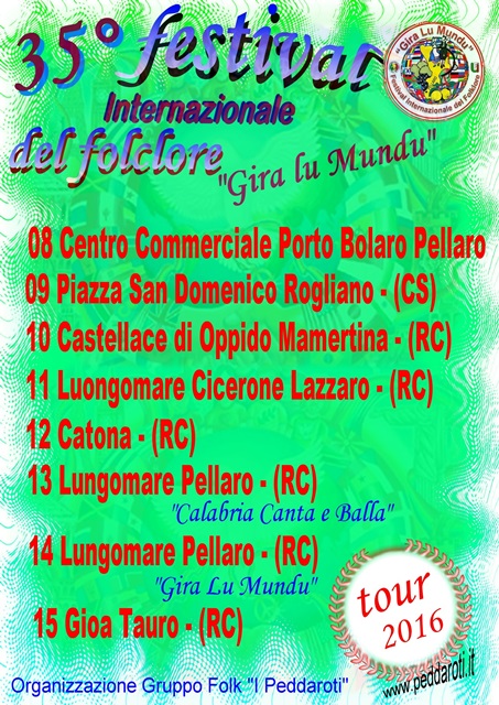 “Divertirci e farvi divertire”…. Con questo spirito nasce nel 1980 il Festival Internazionale del Folklore grazie al Gruppo Folk I Peddaroti, che assumendosi ogni onore ed onere, da 35 anni ripropone questa meravigliosa manifestazione, nel mese di agosto, a Pellaro, in provincia di Reggio Calabria. “Un appuntamento importante – affermano gli organizzatori- per la promozione e la valorizzazione socio-culturale e turistica della zona, un’occasione per esaminare da vicino nuove culture, al fine di comprendere meglio le nostre differenze e di creare amicizia e collaborazione internazionale. Un evento che rappresenta una delle maggiori espressioni culturali ed artistiche per i cittadini italiani e stranieri presenti sul nostro territorio. Il caleidoscopio di colori degli abiti tradizionali dei gruppi della Bolivia, del Cile, dell’Italia e di Montenegro ci regaleranno un colpo d’occhio suggestivo e coinvolgente. Un mix di musiche e danze che suggelleranno la trentacinquesima rassegna folklorica e che ogni anno fa convergere a Reggio Calabria i giovani che, in diverse nazioni, vogliono difendere e portare avanti le tradizioni popolari, quelle che radicano il proprio senso di appartenenza. Durante il soggiorno dei gruppi folkloristici a Pellaro, saranno organizzate sfilate e spettacoli nei paesi limitrofi a Reggio Calabria, per sensibilizzare le tradizioni, gli antichi mestieri, la popolazione locale e il folklore autentico. La coesione di ogni società umana trova espressione in attività e obiettivi comuni. In tutto il mondo, uno degli obiettivi é di creare legami sociali tra individui sulla base di punti comuni di riferimento. I mezzi usati sono diversi, come lo sono le culture e le circostanze, ma in ogni caso il fine centrale é la realizzazione dell’individuo come essere sociale e la speranza che il mondo si unisca in un’unica razza senza più guerre. Il nostro mezzo è quello del folklore e cerchiamo di farlo sempre al meglio al ritmo di TARANTELLA POSITIVA SEMPRE IN ALLEGRIA … divertirci e farvi divertire … perché la tradizione è arte, è storia… la tradizione è vita!!! Con Immenso Orgoglio del Presidente Eugenio Alampi e di tutti i ragazzi “Peddaroti” siamo lieti di presentare il programma definitivo e completo del 35’ Festival Internazionale del Folklore Gira Lu Mundu, frutto di tanti sacrifici e spirito di collaborazione tra tutti i componenti e coloro che ogni anno lavorano insieme per realizzare questo evento tanto atteso”, concludono.