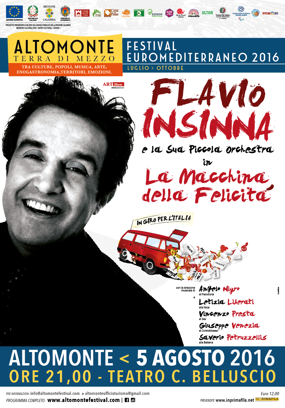 Un piccolo romanzo che diventa uno spettacolo a tutto tondo, tra versi recitati e un repertorio musicale votato alla felicità, quella ritrovata, quella di Vittorio, il protagonista dell’opera itinerante di Flavio Insinna, attore, scrittore e conduttore televisivo. Attraverso le storie dei suoi personaggi, protagonisti della sua “Macchina della Felicità”, l’attore romano trascina gli spettatori in un viaggio interiore, fatto di successi, di gioie, ma anche di rimpianti e occasioni perse o mai afferrate. Vittorio si nasconde dietro il tavolo da gioco di un casinò per non affrontare la vita, l’unico lusso che si concede è il cinema del martedì. Ed è lì che incontra Laura, il vero punto di contatto con la realtà. Ed è proprio con la scusa di rendere felice Laura, che renderà felice se stesso, che con il coraggio cambierà punto di vista e banco di prova. Venerdì 5 agosto alle 21,00 nella splendida cornice del teatro C. Belluscio l’incantesimo avrà inizio: partendo dalle storie custodite tra le pagine del suo ultimo successo, Flavio Insinna non perderà l’occasione di sviscerare il concetto di felicità, romperà gli schemi per instaurare un vero e proprio dialogo con gli spettatori, che a loro volta avranno l’opportunità di condividere idee, pensieri e perché no, anche qualche sorriso. Perché ognuno di noi è una macchina della felicità: ne produciamo e ne provochiamo gli effetti, su di noi e su chi ci gravita intorno. Da conduttore appassionato, beniamino degli italiani delle 20,00, che a tavola non sanno fare a meno del gioco dei pacchi di Affari Tuoi, a showman sui palchi di tutto lo stivale, Flavio Insinna arriva al Festival Euromediterraneo di Altomonte e ci regala una pagina importante per il nostro tempo: quella di tornare a mettersi in gioco per ritrovare la felicità, quella di essere impetuosi, osando di più e assaporando la bellezza della quotidianità. Sarà per questo che nella presentazione del suo romanzo paragona la Macchina della felicità, o meglio la felicità stessa alla ricreazione. Un momento che, in un modo o nell’altro, abbiamo aspettato tutti durante gli anni della scuola dell’obbligo. Forse il primo vero momento di gioia, una delle prime dimostrazioni concrete che la felicità può esistere. L’unico modo per scoprire cosa ci aspetta è non mancare, raggiungere uno dei borghi più belli d’Italia che per l’occasione si trasforma nel borgo della felicità. La passione della sua “Piccola Orchestra”, le note del contrabbasso, le sonorità del sax, il suono del pianoforte e il caldo timbro della voce di Letizia Liberati ci accompagneranno in un viaggio alla scoperta, o meglio alla riscoperta di noi stessi. Non mancheranno l’ironia e le risate, ingredienti fondamentali per la ricerca della felicità.