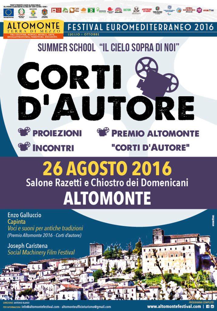Nella settimana dal 23 al 27 agosto Altomonte si trasforma in un vero e proprio villaggio culturale: tra le note degli artisti del Divino Jazz e le tre giornate dedicate allo storytelling di viaggio, venerdì 26 agosto a partire dalle 19,00 nel Chiostro dei Domenicani e nel Salone Razetti vi aspetta una serata dedicata ai Corti d’Autore. Tra i premiati Enzo Galluccio, vincitore per la sezione Turismo Ecosostenibile del Festival Internazionale del Turismo di Lecce con il documentario “Caleidoscopico Aspromonte”, che presenterà al Festival “Capinta. Voci e suoni per antiche tradizioni”, il suo ultimo lavoro girato sul territorio del Parco Nazionale dell’Aspromonte. Come di consueto il tema prediletto dal fotografo è l’antropologia e le tradizioni popolari espresse in qualsiasi forma. Non è infatti un caso che l’autore racconti la vita di uno dei pastori di Roccaforte del Greco e ne valorizzi tutta la lavorazione casearia. Senza tralasciare la tristezza del protagonista rispetto alla drammaticità dell’abbandono dei luoghi in cui si è vissuto. Quest’anno il Festival Euromediterraneo ospita Joseph Caristena, ideatore e direttore artistico del “Social Machinery Film Festival”, una community open source che vuole offrire uno spazio a tutti i filmmaker che si definiscono “Social Change Makers” e che attraverso l’opera audiovisiva tentano di innescare una profonda analisi sociale, favorendo l’interazione con il pubblico. Il primo di una serie di eventi in cantiere che sancisce un’importante collaborazione. Una serata dedicata alla creatività, che si aggiunge al ricco ventaglio di eventi in cartellone e che si intreccia al tema della promozione del territorio attraverso il confronto tra le diverse forme di espressione artistica, dalla musica alla scrittura, dalla fotografia al video. Insomma proprio una Terra di mezzo, intesa come punto di incontro e condivisione.