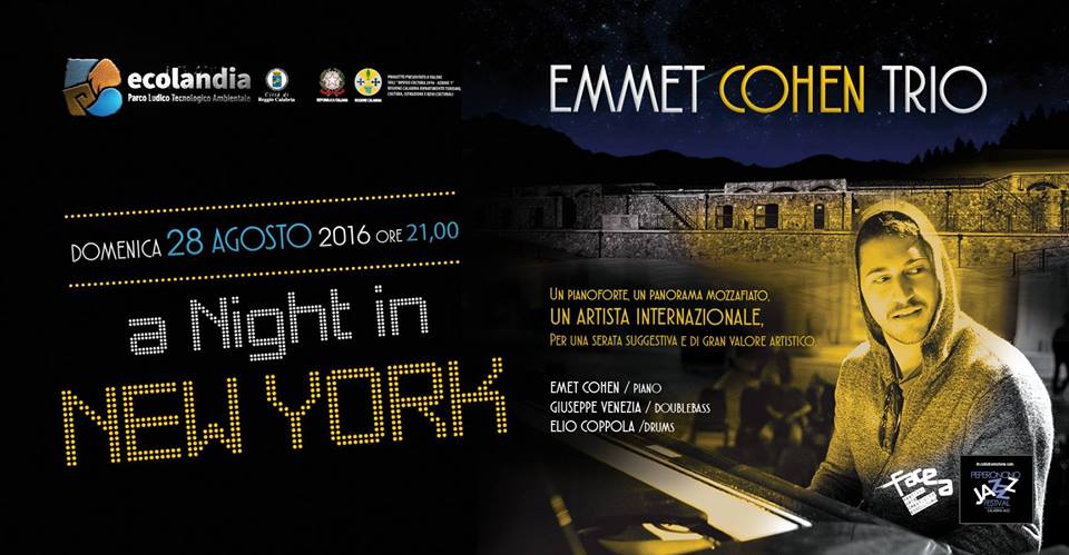 Un pianoforte e un panorama mozzafiato. Sono i due ingredienti di una serata suggestiva dal grande valore artistico che emozionerà i tanti appassionati di jazz. Domenica 28 agosto al Parco Ecolandia di Arghillà a partire dalle ore 21:00 si terrà il concerto di Emmet Cohen Trio “A Night in New York”. Nato nel 2012 dall’incontro tra il pianista americano Emmet Cohen, il contrabbassista lucano Giuseppe Venezia e il batterista napoletano Elio Coppola ha inciso il cd “Infinity” durante le prove del primo tour italiano. A Reggio Calabria il trio proporrà in concerto alcune interpretazioni dei grandi classici del jazz, insieme ad alcune composizioni originali del talento Cohen. Emmet Cohen è stato un vero proprio prodigio del piano, non a caso finalista del prestigioso “Monk Competition”, uno dei concorsi per solisti jazz più importanti al mondo. La sua grande padronanza dello strumento e l’innovativo palato armonico lo hanno reso uno dei più richiesti musicisti della scena jazz di New York, dove collabora regolarmente con grandissimi musicisti tra cui Christian McBride, Maceo Parker, Joshua Redman, Billy Hart, Patty Austin e Carl Allen. Elio Coppola è uno dei più attivi e talentuosi batteristi jazz italiani. Giovane ma già pluripremiato musicista, ha collaborato con artisti del calibro di Joey de Francesco, Benny Golson, Rick Margitza, Jerry Weldon, John di Martino, Mike LeDonne, Peter Bernstein, Dado Moroni, Flavio Boltro, Antonio Faraò, Deidda Brothers, Martin Djaconovsky e Curtis Lundy. Finalmente a Reggio Calabria uno dei più grandi jazzisti al mondo. La padronanza dello strumento e l’innovativo palato armonico lo hanno reso uno dei più richiesti musicisti della scena jazz di New York, dove collabora regolarmente con grandissimi musicisti tra cui Christian McBride, Maceo Parker, Joshua Redman, Billy Hart, Patty Austin. L’evento è realizzato nell’ambito del Face Festival 2016 in collaborazione con il Peperoncino Jazz Fest 2016.