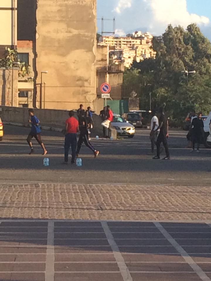Quattro confezioni d’acqua a delimitare le porte, una palla, un gruppo di ragazzi e tanta voglia di divertimento. Potrebbe essere la descrizione di un qualsiasi pomeriggio tra amici, di una partitella di calcio qualsiasi in cortile, invece è quanto si presentava ieri sera, intorno alle 19, dentro il parcheggio del porto di Reggio Calabria in cui attraccano gli aliscafi.