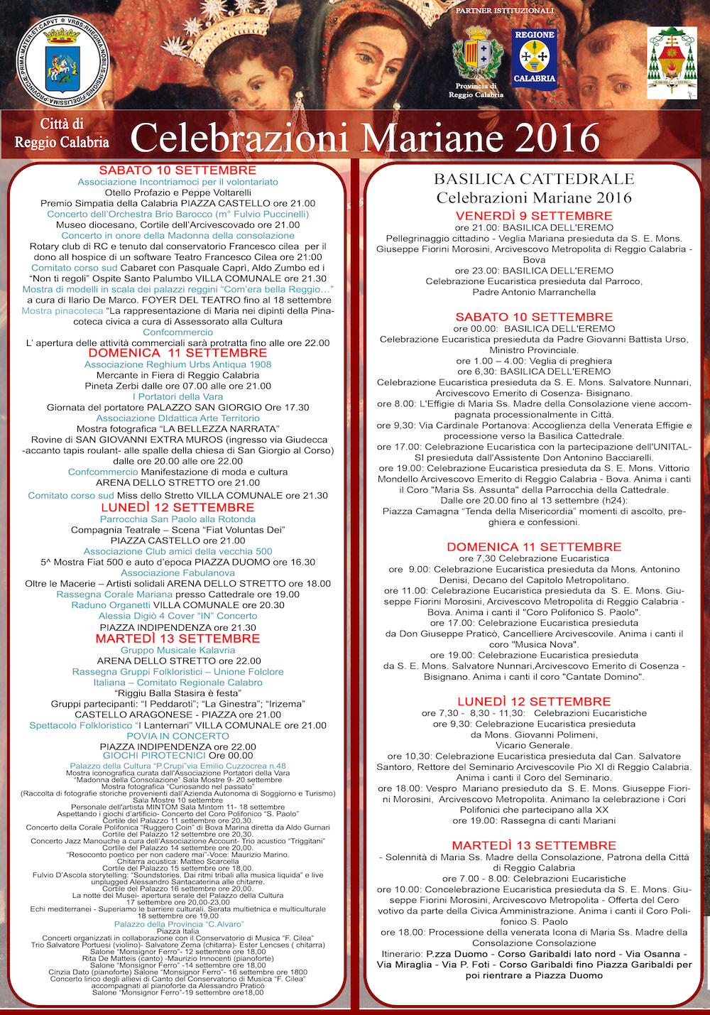 Dopo che il programma per i festeggiamenti religiosi era stato già reso noto da diverse settimane, questa mattina è stato presentato finalmente il calendario completo degli eventi civili in programma a Reggio Calabria in occasione dei festeggiamenti per la Madonna della Consolazione. Come sottolineato dal Consigliere Nicola Paris, quest’anno è stato peculiare il contributo della Regione che ha investito 40.000€ per luminarie, spettacolo pirotecnico e quanto proposto di seguito. Contributo prezioso anche quello della Provincia che ospiterà all’interno del suo palazzo diversi eventi culturali.