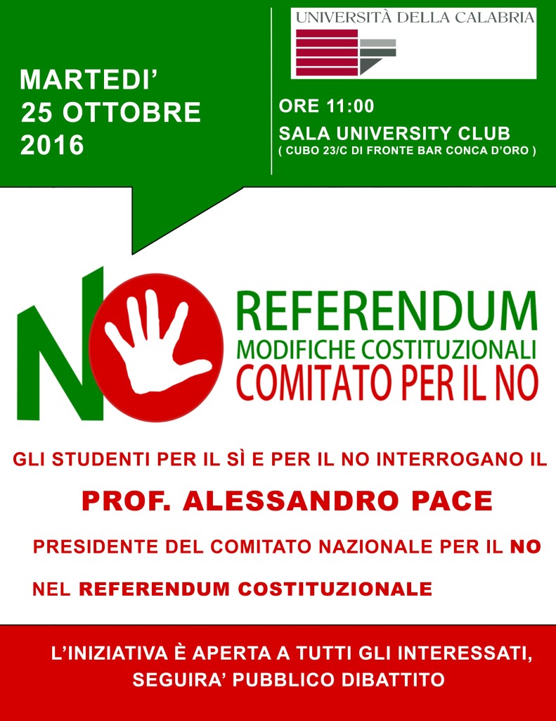 Il comitato UNICAL per il NO nel Referendum Costituzionale rende noto che, “in data 25 ottobre 2016 alle ore 11:00 presso la sala University Club dell’Università della Calabria, si terrà un dibattito sulla riforma costituzionale con il noto costituzionalista Prof. Alessandro Pace, presidente del Comitato nazionale per il NO nel referendum costituzionale. L’iniziativa è rivolta a tutti coloro che vorranno prenderne parte per avere delucidazioni nel merito tecnico della modifica costituzionale. Nel corso dell’incontro ci sarà un format molto originale, in quanto gli studenti per il Sì e gli studenti per il No interrogheranno il professore riguardo la riforma costituzionale. Il comitato UNICAL per il NO ritiene che questo sia un importante incontro per tutti gli studenti dell’ateneo ma anche per i docenti, ricercatori, dipendenti e cittadini che vorranno prenderne parte. Rendersi partecipi e consapevoli è un diritto ma anche un dovere di ogni cittadino e la partecipazione a questo evento non può che essere positiva e utile”.