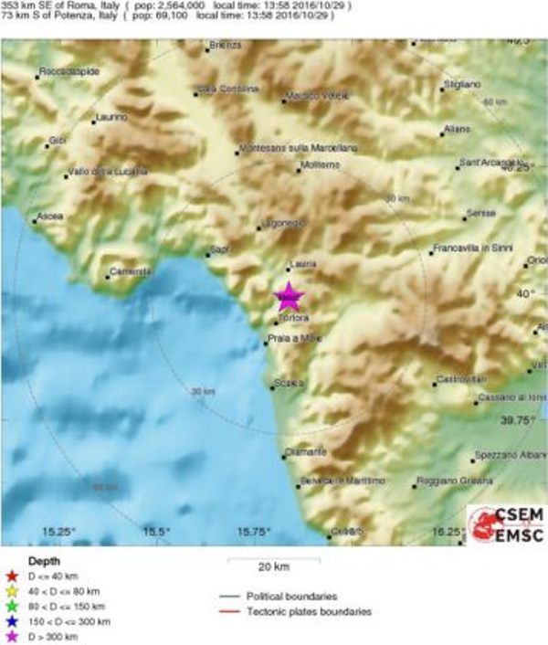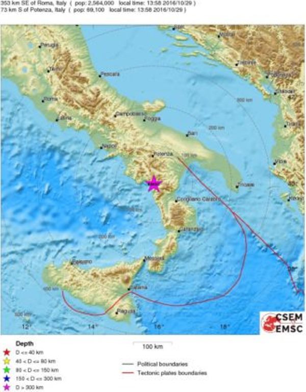 Dopo la forte scossa di terremoto di magnitudo 5.7 alle 22:02 di ieri sera nel basso Tirreno, pochi minuti fa alle 13:58 di oggi un altro terremoto forte, secondo il Centro Sismico Euro Mediterraneo di magnitudo 4.1, ha colpito il Sud Italia, stavolta sulla terraferma tra Calabria, Campania e Basilicata, anche in questo caso a grande profondità (circa 270km). Restiamo comunque in attesa dei dati INGV. Con ogni probabilità si tratta di un’altra scossa profonda nel piano di Wadati-Benioff, stavolta non avvertita dalla popolazione.