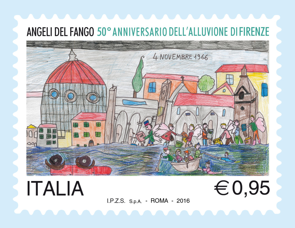 Il Ministero dello Sviluppo Economico emetterà, giovedì 4 novembre, un francobollo celebrativo degli “Angeli del fango”, nel 50° anniversario dell’alluvione di Firenze. Il francobollo, del valore di € 0,95, è stampato dall’Istituto Poligrafico e Zecca dello Stato S.p.A., in rotocalcografia, su carta bianca, patinata neutra, autoadesiva, non fluorescente; in cinque colori e una tiratura di ottocentomila esemplari. L’immagine raffigura l’alluvione di Firenze del 1966 “interpretata”, attraverso un disegno, dai bambini di una scolaresca. Il bozzetto è stato curato dal Comitato “2016 Progetto Firenze”, con l’ottimizzazione del Centro Filatelico della Direzione Officina Carte Valori e Produzioni Tradizionali dell’Istituto Poligrafico e Zecca dello Stato S.p.A. Completano il francobollo le legende “ANGELI DEL FANGO” e “50° ANNIVERSARIO DELL’ALLUVIONE DI FIRENZE”, la scritta “ITALIA” e il valore “€ 0,95”. A commento dell’emissione è stato realizzato il bollettino illustrativo con articolo a firma di Dario Nardella, Sindaco di Firenze. Lo Sportello Filatelico dell’Ufficio Postale di Firenze V.R. utilizzerà, il giorno di emissione, l’annullo speciale realizzato da Filatelia di Poste Italiane. Il francobollo ed i prodotti filatelici correlati saranno disponibili presso gli Uffici Postali abilitati, gli “Spazio Filatelia” di Roma, Milano, Venezia, Napoli, Trieste, Torino, Genova e sul sito poste.it.