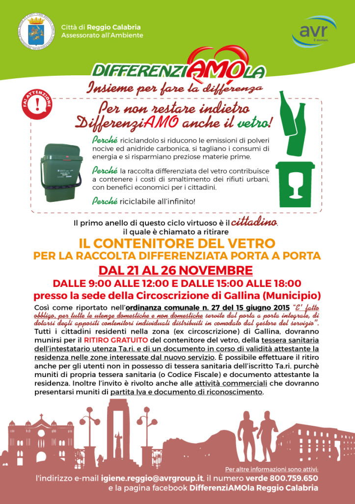 Il nuovo servizio è stato presentato ieri, mercoledì 16 novembre alle ore 16:30 presso il Parco Botteghelle “Federica Cacozza” di viale Calabria, alla presenza del Sindaco Giuseppe Falcomatà, dell’Amministratore Delegato di AVR Claudio Nardecchia, dell’Assessore Antonino Zimbalatti, del Presidente del Consiglio comunale Demetrio Delfino e della Dirigente del Settore Ambiente Loredana Pace. In quell’occasione sono stati diffusi i dati sui risultati raggiunti e sono stati informati i cittadini sulle modalità del nuovo servizio, che ha preso avvio con le consegne dei contenitori dedicati alla raccolta differenziata porta a porta, che si terranno a partire da OGGI 17 NOVEMBRE (DOMENICA ESCLUSA) DALLE 9:00 ALLE 12:00 E DALLE 15:00 ALLE 18:00 presso l’AREA PARCHEGGIO Terminale Bus ATAM di Largo Botteghelle. Contestualmente al nuovo avvio, nelle zone di Sbarre, Ferrovieri-Gebbione e del quartiere di S. Giorgio Extra, è stata introdotta un’altra importante novità: la raccolta differenziata e selettiva del vetro. Con lo slogan “Per non restare indietro DifferenziAMO anche il vetro!” Si consegnerà infatti, all’interno del kit, anche un nuovo mastello di colore verde, che contribuirà al miglioramento della raccolta differenziata. Il vetro se ben selezionato è riciclabile all’infinito, perché riciclandolo si riducono le emissioni di polveri nocive ed anidride carbonica, si tagliano i consumi di energia e si risparmiano preziose materie prime. E soprattutto perché la raccolta differenziata del vetro contribuisce a contenere i costi di smaltimento dei rifiuti urbani, con benefici economici per i cittadini.