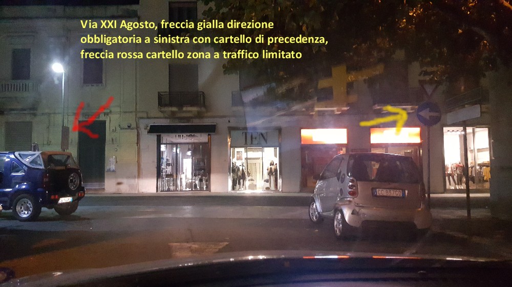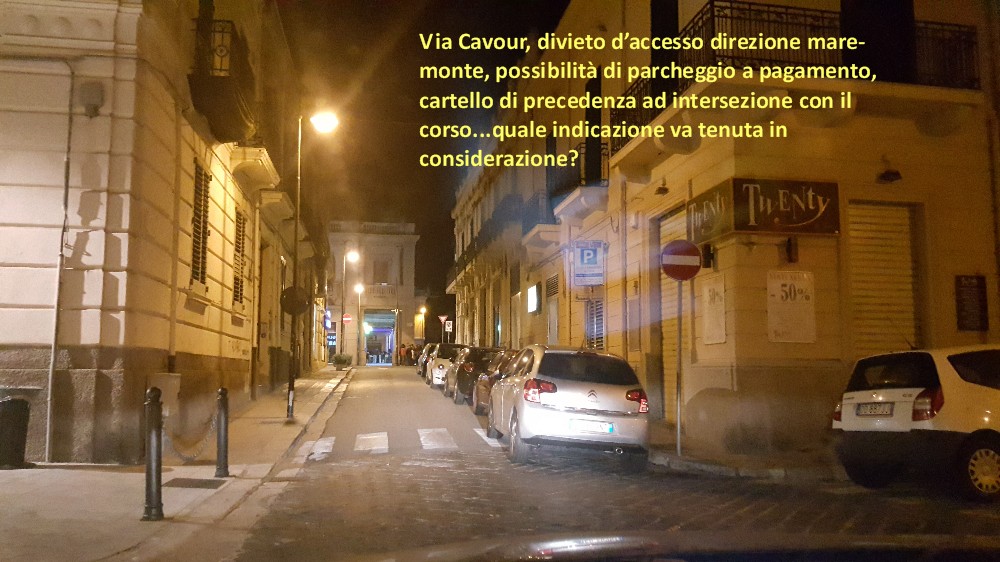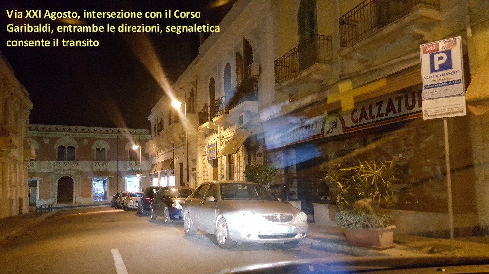 E’ necessario che si faccia chiarezza sul transito dei mezzi sul Corso Garibaldi, inteso per la porzione che inizia al McDonald’s fino a piazza Duomo, in quanto vi sono alcuni cartelli che indicano la zona a traffico limitato, ma gli stessi sono privi di validità in quando sono posizionati in contrasto con l’altra segnaletica stradale; come si evince dalle foto a corredo, dalle vie che si intersecano con il corso è assolutamente concesso il transito, d’altra parte qualora non lo fosse tali vie perderebbero la loro funzione di collegamento. Via Cairoli, nel primo tratto accessibile solo provenendo dal corso, allo stato attuale non può essere transitata dalla via S. Francesco da Paola; la via Gesualdo Melacrino con un divieto d’accesso valido solo il martedì e giovedì così come riportato sul cartello, e che riporta un cartello di precedenza nel tratto ad intersezione con il corso, andrebbe chiusa dato che non potendo poi procedere sul corso verrebbe anche scomodo e pericoloso parcheggiare e dover immettersi su via S. Francesco da Paola in retromarcia; la Via XXI Agosto che termina ad intersezione con il Corso Garibaldi prevede un cartello di precedenza e di direzione obbligatoria a sinistra, ovvero sul Corso Garibaldi, ma pochi metri dopo vi è un cartello di zona a traffico limitato, che però non viene ripetuto dopo la successiva prosecuzione della via XXI Agosto a due sensi di marcia che si interseca anch’essa con il Corso Garibaldi, né dopo Via Lemos accessibile sempre dal Corso, e continuando così fino a piazza Duomo con le due vie successive. Anche nei pressi della Questura, la via Guglielmo Pepe , riporta un cartello di direzione consentita ad intersezione con il Corso, senza nessun divieto di transito o avviso di zona a traffico limitato! Anche all’incrocio con il McDonald’s, la via Aspromonte riporta un cartello d’obbligo con direzione sia per avanti che verso sinistra, sempre sul Corso Garibaldi. Tali incongruenze di segnaletica, unite ai cartelli di divieto di sosta lungo tutto il corso che appunto indicano sì il divieto della sola sosta ma non della fermata (quindi è previsto il transito?) stanno creando vari disagi alla viabilità ed incomprensioni con le forze dell’ordine, chi dice che si può passare chi no, fatto sta che se una segnaletica indica la possibilità di proseguire sul corso non si può certo sanzionare e contestare chi vi transita. E’ necessario che si faccia chiarezza onde evitare inutili grattacapi per i cittadini reggini già abbastanza provati da faccende ben più importanti del discutere su due cartelli in contrasto fra loro, queste barzellette non potevano che capitare nella neo Città Metropolitana!