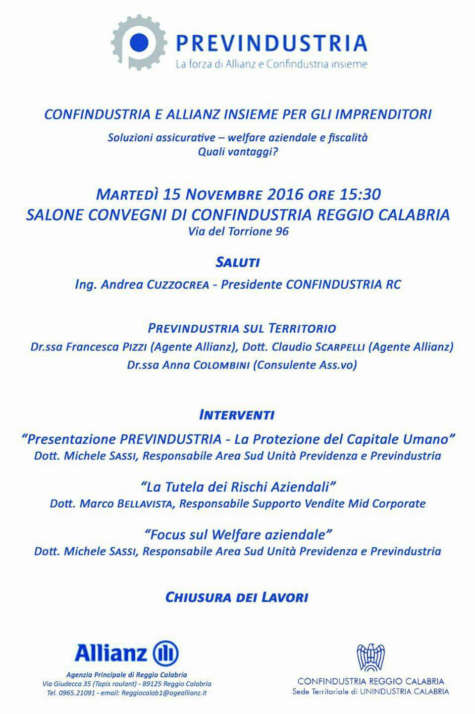 E’ in programma domani, martedì 15 novembre alle ore 15.30, nella sala convegni di Confindustria Reggio Calabria (via del Torrione, 96), il convegno dal titolo “Welfare aziendale e fiscalità, quali vantaggi?”, organizzato da Previndustria, la società con cui Confindustria e Allianz da oltre 30 anni offrono soluzioni e assistenza assicurativa e finanziaria alle imprese. L’iniziativa si aprirà con i saluti del presidente di Confindustria Reggio Calabria, Andrea Cuzzocrea, degli agenti Allianz, Francesca Pizzi e Claudio Scarpelli e del consulente assicurativo Anna Colombini. Previsti inoltre gli interventi di Michele Sassi, responsabile Area sud unità previdenza e Previndustria che relazionerà sulla protezione del capitale umano e sul welfare aziendale e di Marco Bellavista, responsabile supporto vendite Mid corporate che interverrà sulla tutela dei rischi aziendali.
