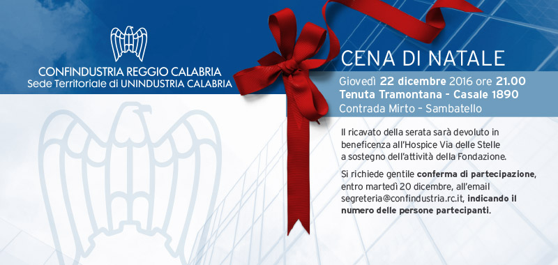 E’ in programma il prossimo giovedì 22 dicembre alle ore 18, nel Salone di Confindustria Reggio Calabria (Via del Torrione, 96), l’assemblea pubblica dell’associazione degli Industriali reggini. Al centro dei lavori del consueto appuntamento annuale, verranno posti i temi di stringente attualità legati alle dinamiche di crescita e sviluppo del territorio calabrese e in particolare reggino, quali, fra gli altri, il porto di Gioia Tauro, il Decreto Reggio, lo stato di salute dell’economia locale e del tessuto produttivo, il sistema dei trasporti locale, il rilancio delle grandi opere e del comparto costruzioni e la nascente Città metropolitana di Reggio Calabria. L’incontro si aprirà con i saluti del presidente di Unindustria Calabria, Natale Mazzuca e proseguirà con la relazione del presidente di Confindustria Reggio Calabria, Andrea Cuzzocrea. Le conclusioni saranno affidate al sindaco di Reggio Calabria, Giuseppe Falcomatà. Il programma proseguirà, in serata, con un incontro conviviale organizzato dall’Associazione degli Industriali per lo scambio degli auguri di Natale. L’appuntamento è fissato alle ore 21 presso la struttura “Tenuta Tramontana – Casale 1890” in Contrada Mirto – Sambatello. Il ricavato della serata sarà devoluto in beneficenza all’Hospice Via delle Stelle a sostegno dell’attività della Fondazione.