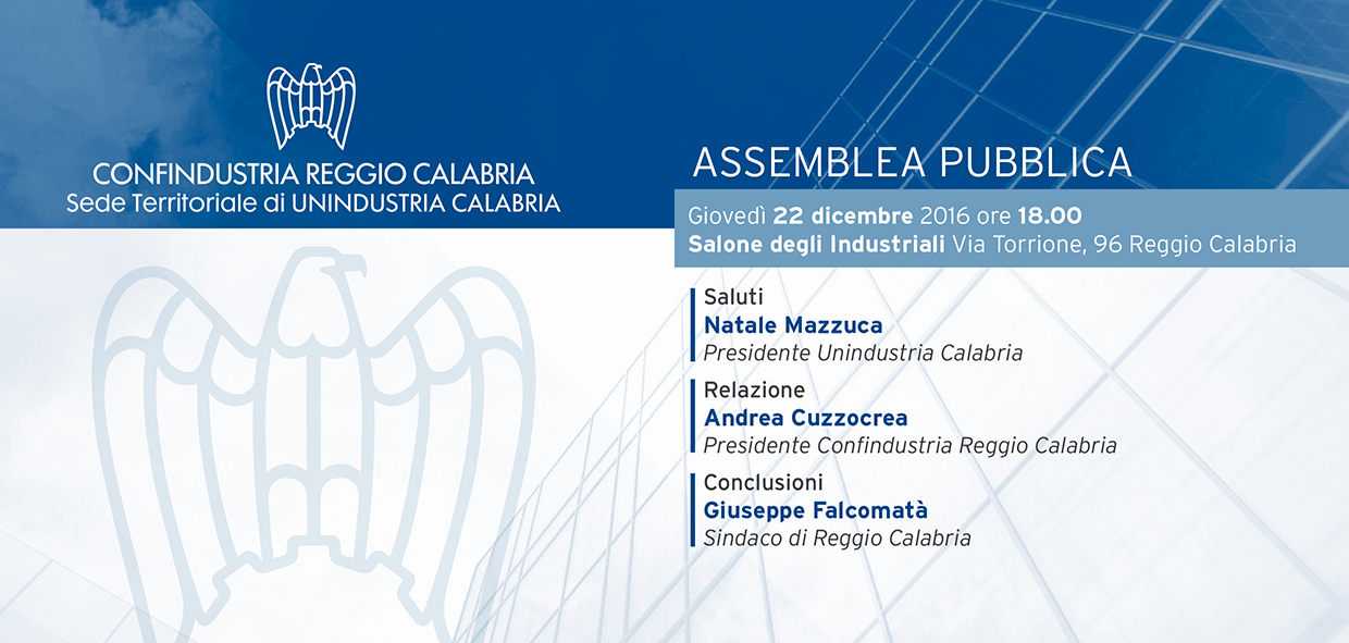 E’ in programma il prossimo giovedì 22 dicembre alle ore 18, nel Salone di Confindustria Reggio Calabria (Via del Torrione, 96), l’assemblea pubblica dell’associazione degli Industriali reggini. Al centro dei lavori del consueto appuntamento annuale, verranno posti i temi di stringente attualità legati alle dinamiche di crescita e sviluppo del territorio calabrese e in particolare reggino, quali, fra gli altri, il porto di Gioia Tauro, il Decreto Reggio, lo stato di salute dell’economia locale e del tessuto produttivo, il sistema dei trasporti locale, il rilancio delle grandi opere e del comparto costruzioni e la nascente Città metropolitana di Reggio Calabria. L’incontro si aprirà con i saluti del presidente di Unindustria Calabria, Natale Mazzuca e proseguirà con la relazione del presidente di Confindustria Reggio Calabria, Andrea Cuzzocrea. Le conclusioni saranno affidate al sindaco di Reggio Calabria, Giuseppe Falcomatà. Il programma proseguirà, in serata, con un incontro conviviale organizzato dall’Associazione degli Industriali per lo scambio degli auguri di Natale. L’appuntamento è fissato alle ore 21 presso la struttura “Tenuta Tramontana – Casale 1890” in Contrada Mirto – Sambatello. Il ricavato della serata sarà devoluto in beneficenza all’Hospice Via delle Stelle a sostegno dell’attività della Fondazione.