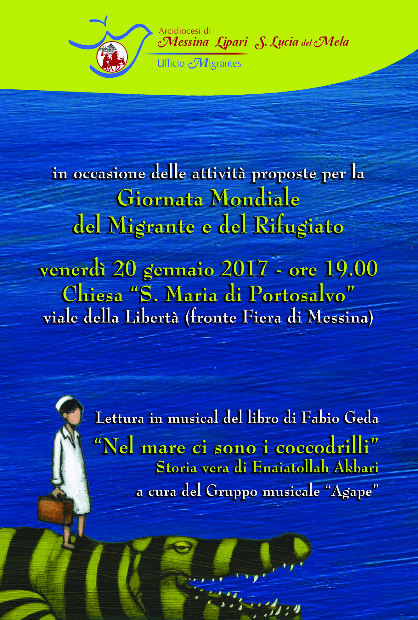Si svolgerà nella Chiesa “S. Maria di Portosalvo” l’ultimo dei 3 eventi programmati dall’Ufficio diocesano Migrantes in occasione della Giornata Mondiale del Migrante e del Rifugiato 2017. Oggi, 20 gennaio, alle ore 19.00, verrà proposto un momento di riflessione sulle migrazioni forzate e sul dramma dei minori stranieri non accompagnati, attraverso la lettura di alcuni passi del libro “Nel mare ci sono i coccodrilli” di Fabio Geda, con il commento musicale del Gruppo “Agape”.