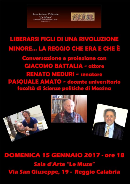 Nell’ambito della programmazione de “Laboratorio delle Arti e delle Lettere – Le Muse” di Reggio Calabria continuano gli appuntamenti del sodalizio con una manifestazione domenica 15 dichiara Giuseppe Livoti – presidente Muse che farà riflettere sui cambiamenti che la città ha avuto dal 1970 in poi. L’appuntamento è alle ore 18 alla Sala D’Arte, dedicato a “Liberarsi figli di una rivoluzione minore…la Reggio che era e che è”. Punto di partenza sarà la proiezione del film del 2007 raccontato per il cinema dall’attore Giacomo Battaglia in “Liberarsi – Figli di una rivoluzione minore” che vede come protagonista di Pietro, giornalista televisivo italo-canadese che arriva a Reggio Calabria con la salma della madre per darle degna sepoltura nella città natia. Scopre presto che il padre è morto durante i Moti di Reggio del 1970. Ad aiutarlo a far luce sul mistero ci sono Alba, Don Pino e Maria. Il Film è stato girato interamente tra Reggio e i comuni limitrofi, con quasi 200 comparse impiegate, scene ambientate a Gambarie e che ricordano anche le –famose- barricate e con la partecipazione di attori come Giuseppe Zeno e Monica Guerritore. Un punto di partenza per un dibattito ed un momento di riflessione visiva su quello che è stata la città e che è oggi insieme alla testimonianza dell’attore reggino Battaglia e di due illustri ospiti che metteranno in evidenza le diverse ragioni di tale ricordo che cambiò le sorti della città. Saranno ospiti cosi alle Muse il senatore Renato Meduri che ha vissuto tale momento storico ed il prof. Pasquale Amato – docente universitario della facoltà di Scienze Politiche di Messina.