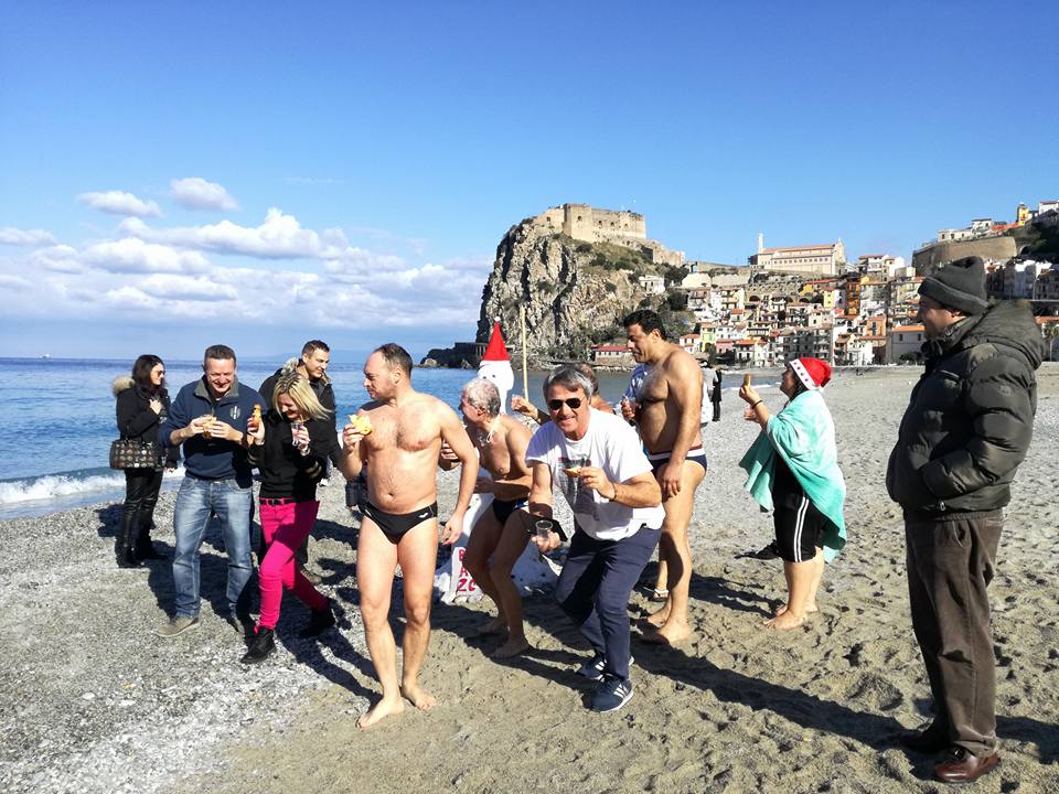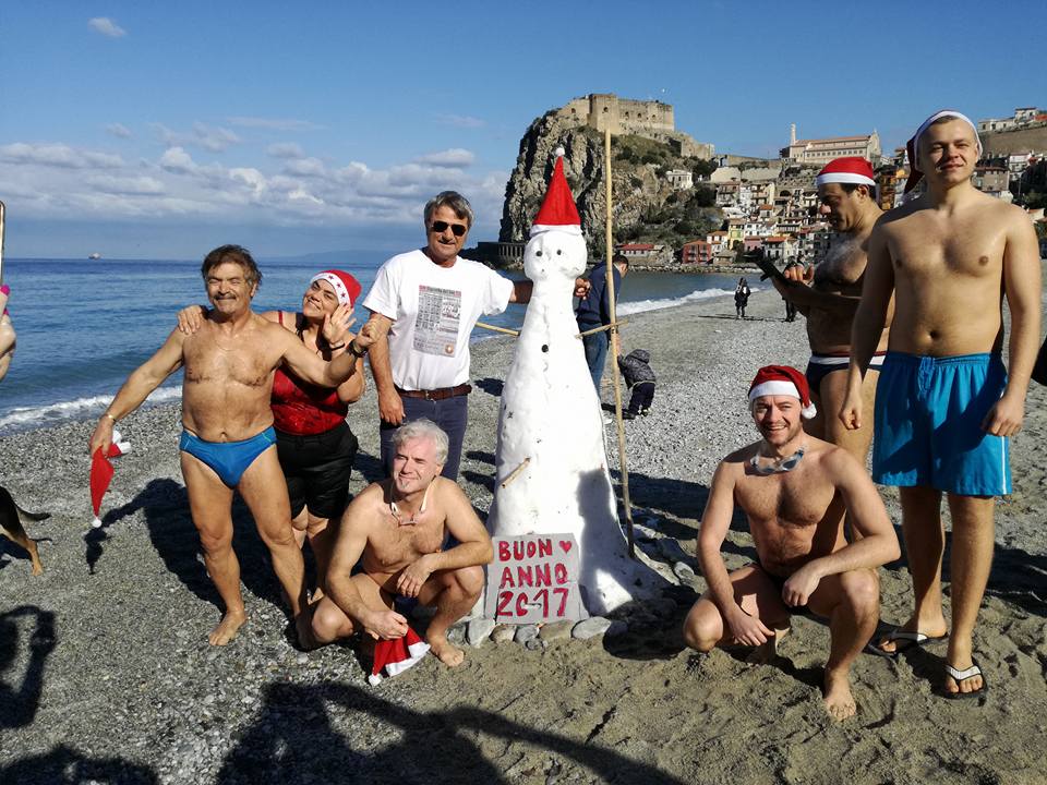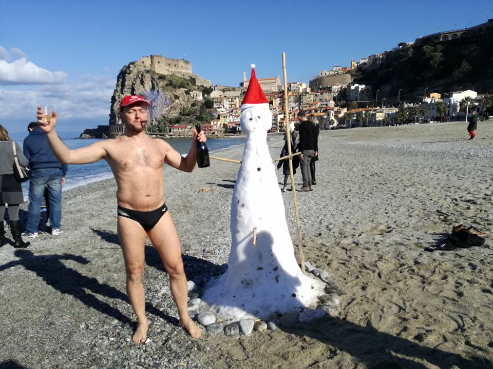 Ed è così che un numero significativo di persone ha avvistato stamane una strana figura in riva al mare, sulla spiaggia scillese, una dama bianca che in molti asserivano essere una sposa. All’avvicinarsi , l’estremo stupore delle persone non trovava certezza nell’essere presente ad una vera costruzione di neve, e nell’incredulità generale, tanti andavano a toccare con mano la neve, ritenuta dapprima altro tipo di materiale bianco (cotone, polistirolo, plastica, etc etc) A mezzogiorno circa, si è proceduti al tuffo di Capodanno, attorniati da numerosissimi spettatori forestieri armati di fotocamere. Tantissime le famiglie attirate coi loro bambini dal pupazzo di neve e dai nuotatori invernali in tenuta estiva, tante le richieste di foto ricordo. Si è proseguito poi con un piccolo spuntino offerto ai presenti a base di panettone e spumante. È stato un piccolo evento, ma ha dato un grande significato ad un Capodanno altrimenti troppo “regolare”.