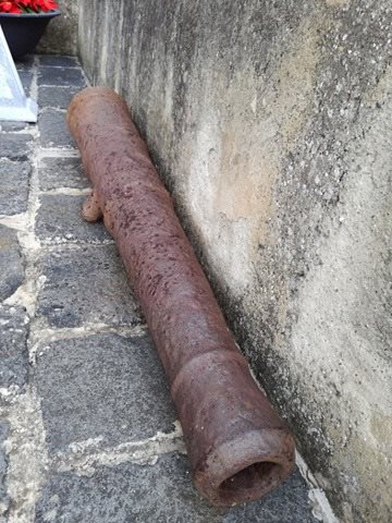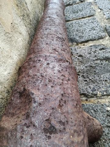 “Il cannone giace veramente sulla pavimentazione esterna del cortile del Castello Ruffo, esposto alle intemperie senza nessun riguardo, arrugginito e senza alcuna traccia di operazioni di recupero o conservazione, visibilmente danneggiato e abbandonato come un rifiuto. A lato , due specie di supporti che realmente ricordano due lapidi, presumibilmente di pietra, che sicuramente sono stati progettati per accogliere la vetusta arma. Il Comitato “Piazza San Rocco” ha iniziato a raccogliere documentazione sull’arma , anche per aver una minima idea della sua storia e aver un idea di come fosse in origine; non essendo né esperti né archeologi, hanno iniziato le ricerche per puro spirito di conoscenza e formulato delle ipotesi dopo una veloce ricerca; l’ arma , in pessimo stato di conservazione, sembrerebbe essere un cannone o meglio Colubrina, ovvero una tipologia di cannone che ha un maggiore rapporto di lunghezza rispetto al calibro, privilegiandola gittata e la velocità del proiettile rispetto ad un cannone classico; è lungo m 2,00 e con calibro di circa 8 cm ; è mancante un orecchione , ovvero uno dei perni che escono lateralmente consentendo la rotazione verticale; tale danneggiamento si suppone sia stata la causa all’ epoca dell’abbandono dell’arma interrandola nel sito ove è stato ritrovata. Probabilmente era in dotazione a una nave mercantile che la usava per difesa. La superficie metallica si presenta corrosa uniformemente, e costellata di piccoli crateri da corrosione”, proseguono.
