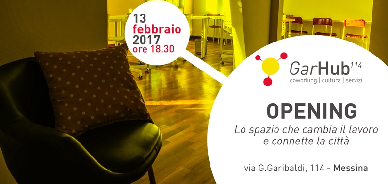 Uno spazio al servizio di chiunque voglia trovare a Messina, in pieno centro storico, un luogo di lavoro temporaneo, flessibile e dinamico. GarHub114, l’open space dedicato a liberi professionisti, freelance e start up, apre ufficialmente le porte alla cittadinanza, lunedì 13 febbraio 2017 alle ore 18:30 in Via Garibaldi 114 (secondo piano). All’evento inaugurale saranno presenti: il Direttore dell’Agenzia Nazionale Giovani, dott. Giacomo D’Arrigo, don Sergio Siracusano, direttore dell’Ufficio per i problemi sociali e il lavoro e tutor del Progetto Policoro e alcuni rappresentati della Filiera del Progetto Policoro (MCL, Confartigianato, Cisl, Ucid, Addiopizzo e Confcooperative).
