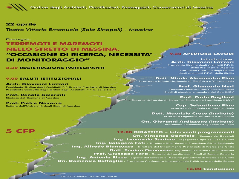 Si è svolto ieri, a distanza di quasi tre anni dal Simposio svoltosi nella stessa sede, il convegno organizzato dall’Ordine degli Architetti di Messina, sul tema “Terremoti e maremoti nello Stretto di Messina. Occasione di ricerca, necessità di monitoraggio“. A relazionare i vertici dell’INGV con il Presidente prof. Carlo Doglioni, il membro del CDA prof. Giancarlo Neri dell’Università di Messina e il Ricercatore Dott. Nicola Alessandro Pino.