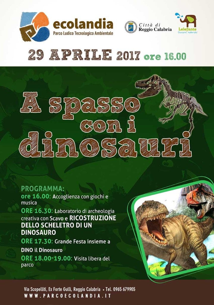 Ieri pomeriggio a partire dalle ore 16:30, presso il Parco Ecolandia ex Forte Gullì a Reggio Calabria, si è svolto il laboratorio di archeologia creativa “A spasso con i dinosauri”. Lo scopo di questo incontro è stato quello di far trascorrere ai più piccoli un pomeriggio all’insegna del “divertimento intelligente”, per fare giocare i bimbi in maniera creativa, a contatto con la natura e in un ambiente “fuori dal comune”. Ad apertura del laboratorio c’è stata l’accoglienza per i più piccoli con giochi e musica, successivamente si è svolto un laboratorio di archeologia creativa con scavo e ricostruzione dello scheletro di un dinosauro, alle 17:30 grande festa in compagnia di Dino il dinosauro e per concludere la visita del bellissimo Parco Ecolandia.