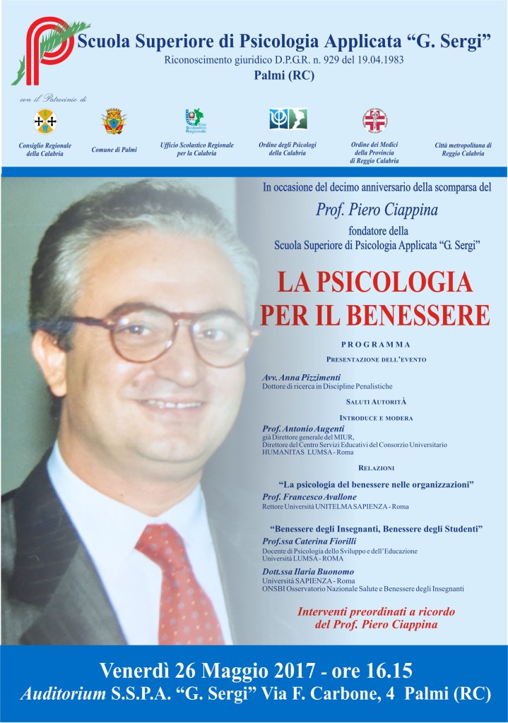 La Scuola Superiore di Psicologia Applicata “G. Sergi” organizza il Convegno di studi sul tema “La Psicologia per il Benessere” che si svolgerà venerdì 26 maggio, alle ore 16.15 presso l’Auditorium della Scuola. L’evento è stato organizzato in occasione del decimo anniversario della scomparsa del Prof. Piero Ciappina, fondatore della Scuola “G. Sergi”, ed è patrocinato dal Consiglio Regionale della Calabria, dalla Città Metropolitana di Reggio Calabria, dal Comune di Palmi, dall’USR Calabria, dall’Ordine degli Psicologi della Calabria e dall’Ordine dei Medici della Provincia di Reggio Calabria. Interverranno il prof. Francesco Avallone – Rettore Università UNITELMA SAPIENZA -Roma , la prof.ssa Caterina Fiorilli – Docente di Psicologia dello Sviluppo e dell’Educazione Università LUMSA –ROMA. e la Dott.ssa Ilaria Buonomo – Università SAPIENZA -Roma- ONSBI Osservatorio Nazionale Salute e Benessere degli Insegnanti. Moderatore sarà il prof. Antonio Augenti, già Direttore generale del MIUR, Direttore del Centro Servizi Educativi del Consorzio Universitario HUMANITAS – LUMSA –Roma, mentre l’avv. Anna Pizzimenti, Dottore di ricerca in Discipline Penalistiche, presenterà l’evento. Al termine, gli amici ricorderanno la figura del prof. Piero Ciappina che, con il suo impegno ed i suoi studi e ricerche in ambito psicologico ed educativo, ha contribuito alla formazione di molti giovani ed alla crescita culturale del territorio calabrese e non solo.